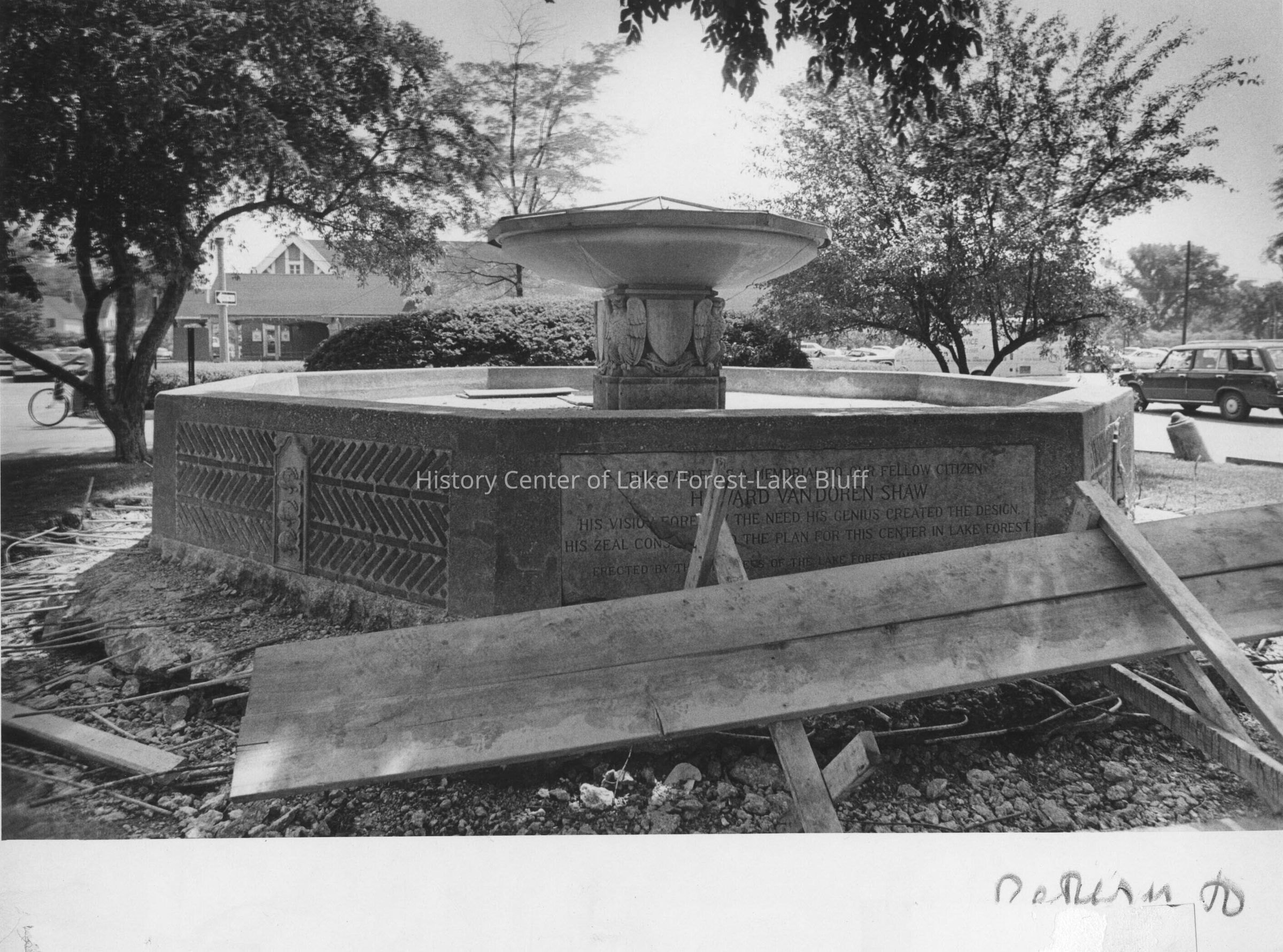 Black and white photograph of fountain in Market Square, under some construction, 700 North Western Avenue.