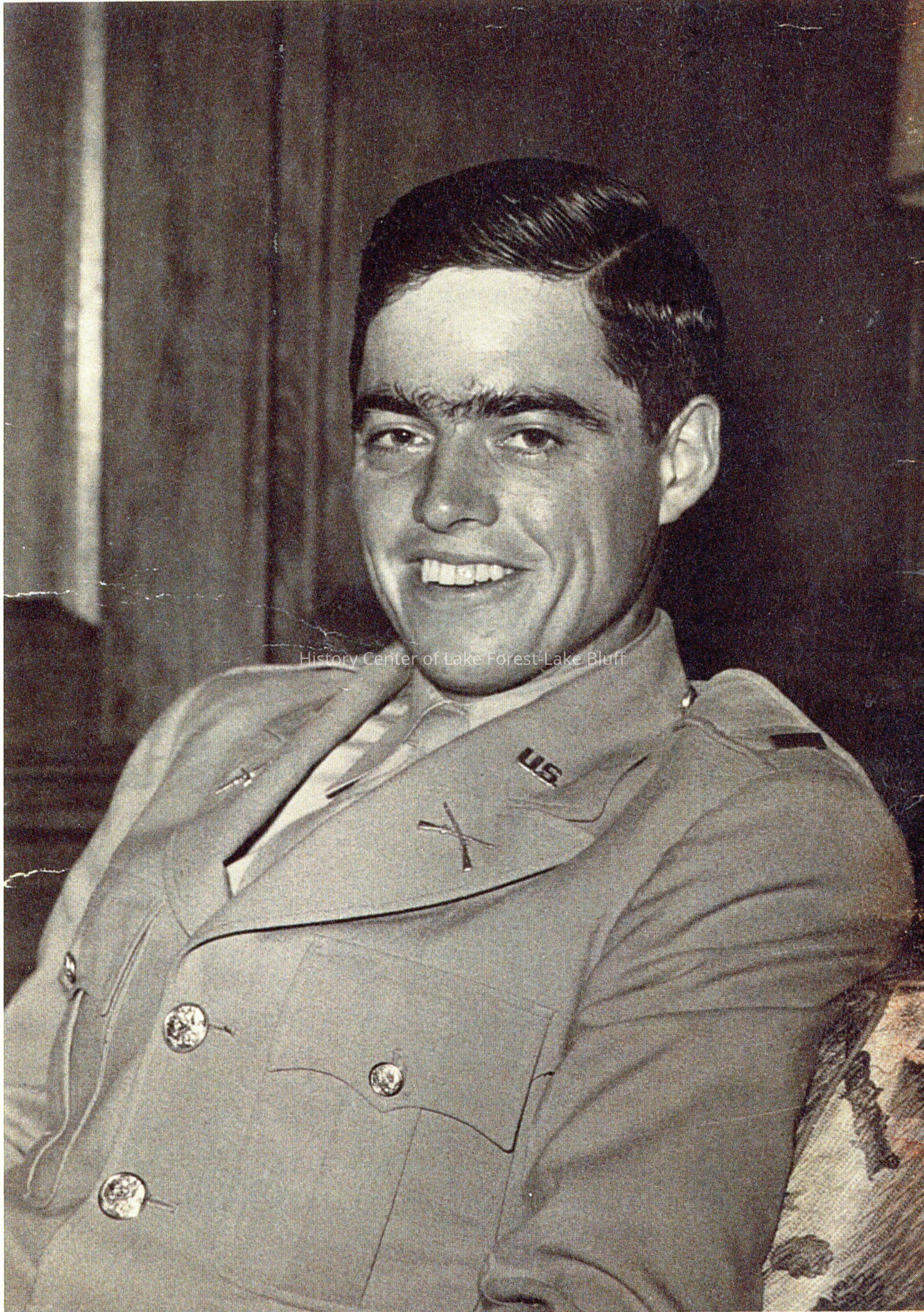 The image shows a young man smiling in a military uniform.