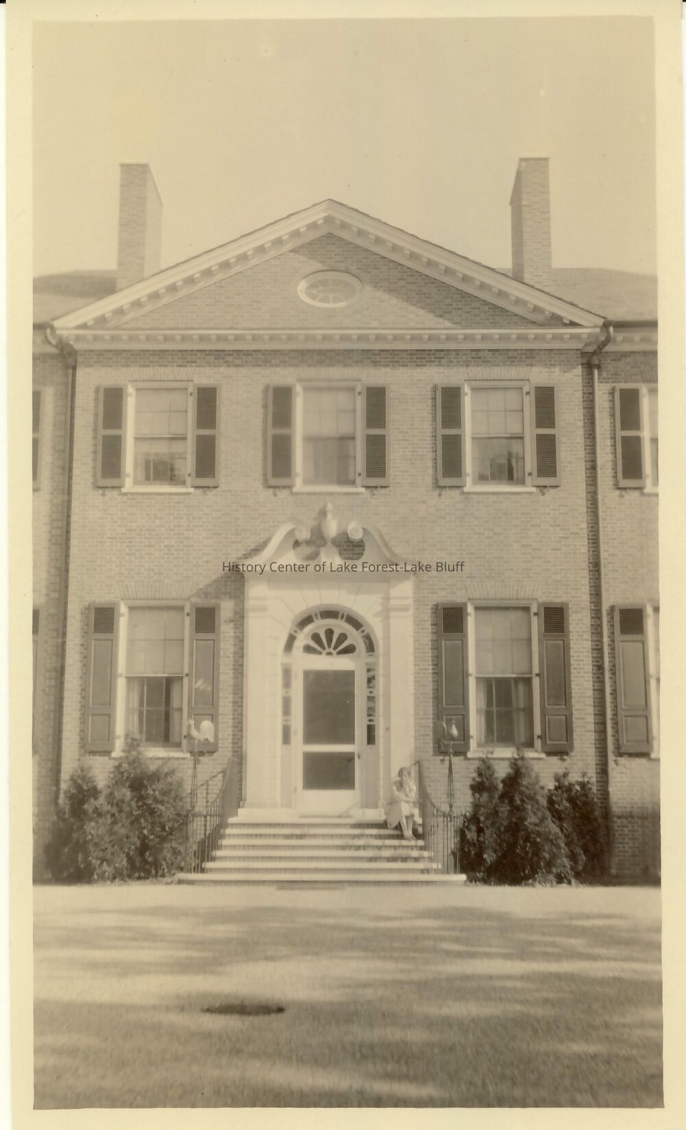 Robert and Grace Farwell McGann house - 965 E. Deerpath - Fairlawn Woman sitting on front steps of brick two-story residence - probably Grace McGann ca. 1925