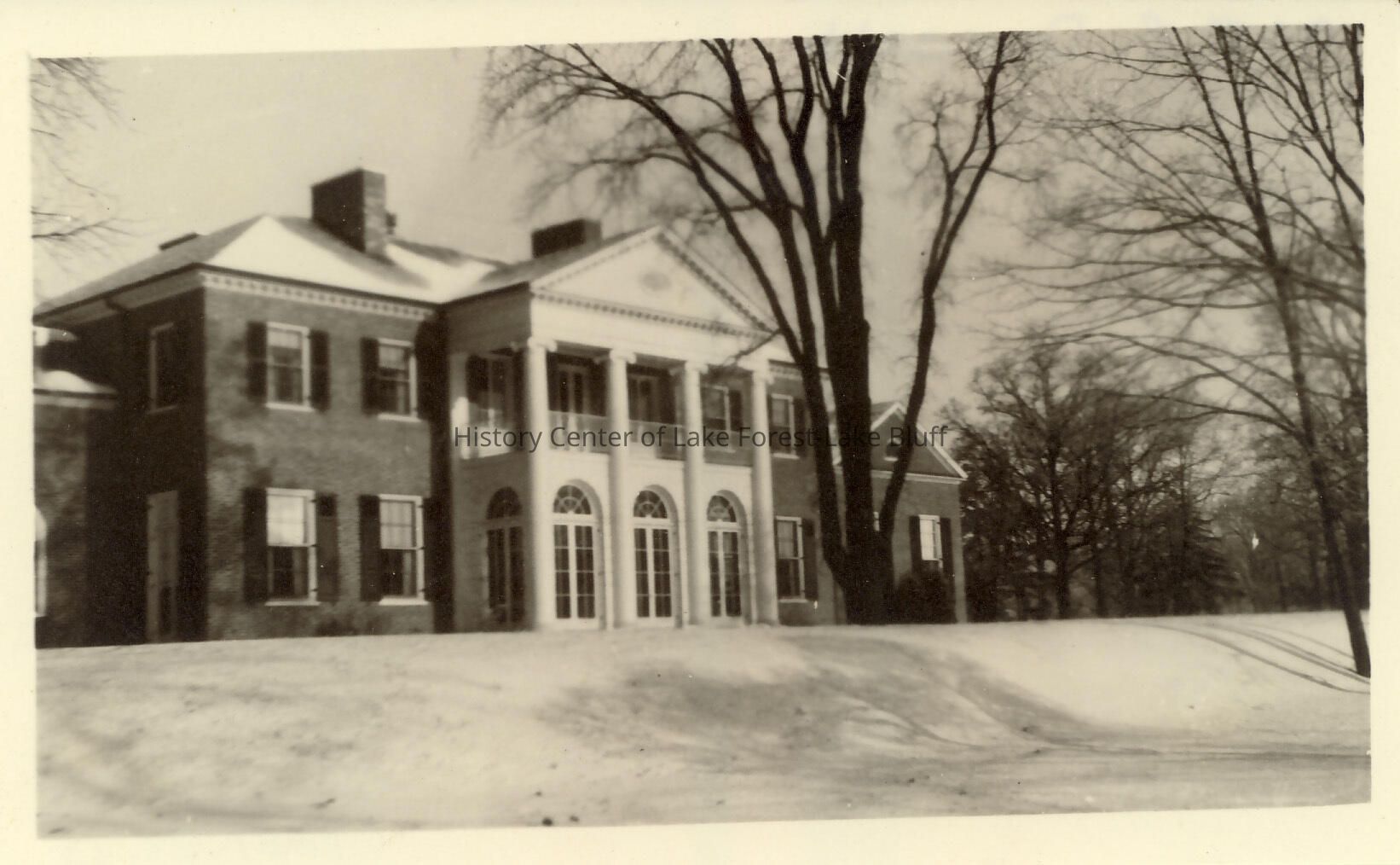 Robert and Grace Farwell McGann rear of house with arched French doors and four pillars. Snow on roof and ground. 965 E. Deerpath - Fairlawn