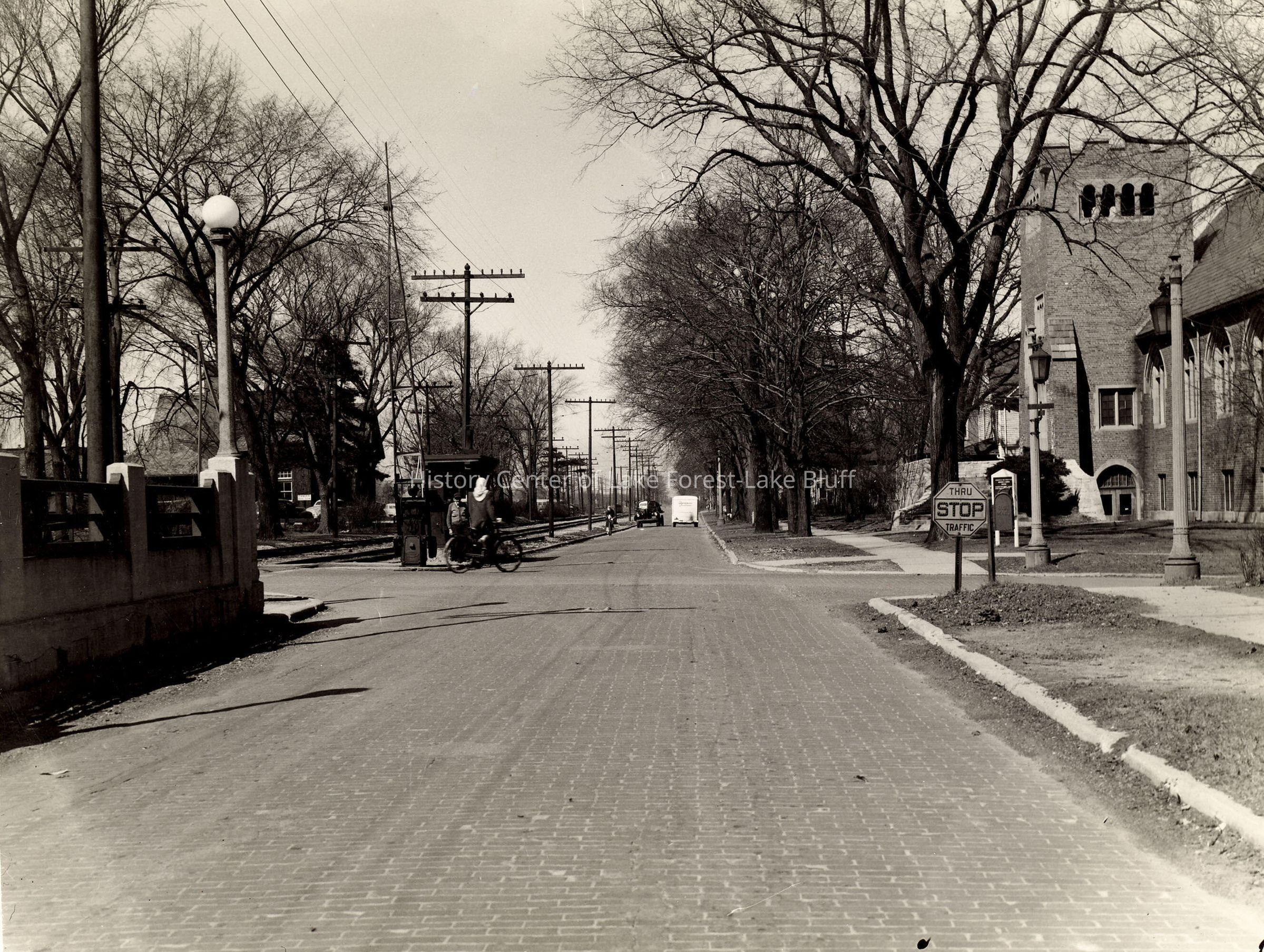 Intersection of McKinley Road and Deerpath, looking north. North Shore Line (Interurban) tracks at left. McKinley is paved in brick. There are people on bicycles on the road. The Church of the Covenants is at right. 1930s-1940s.