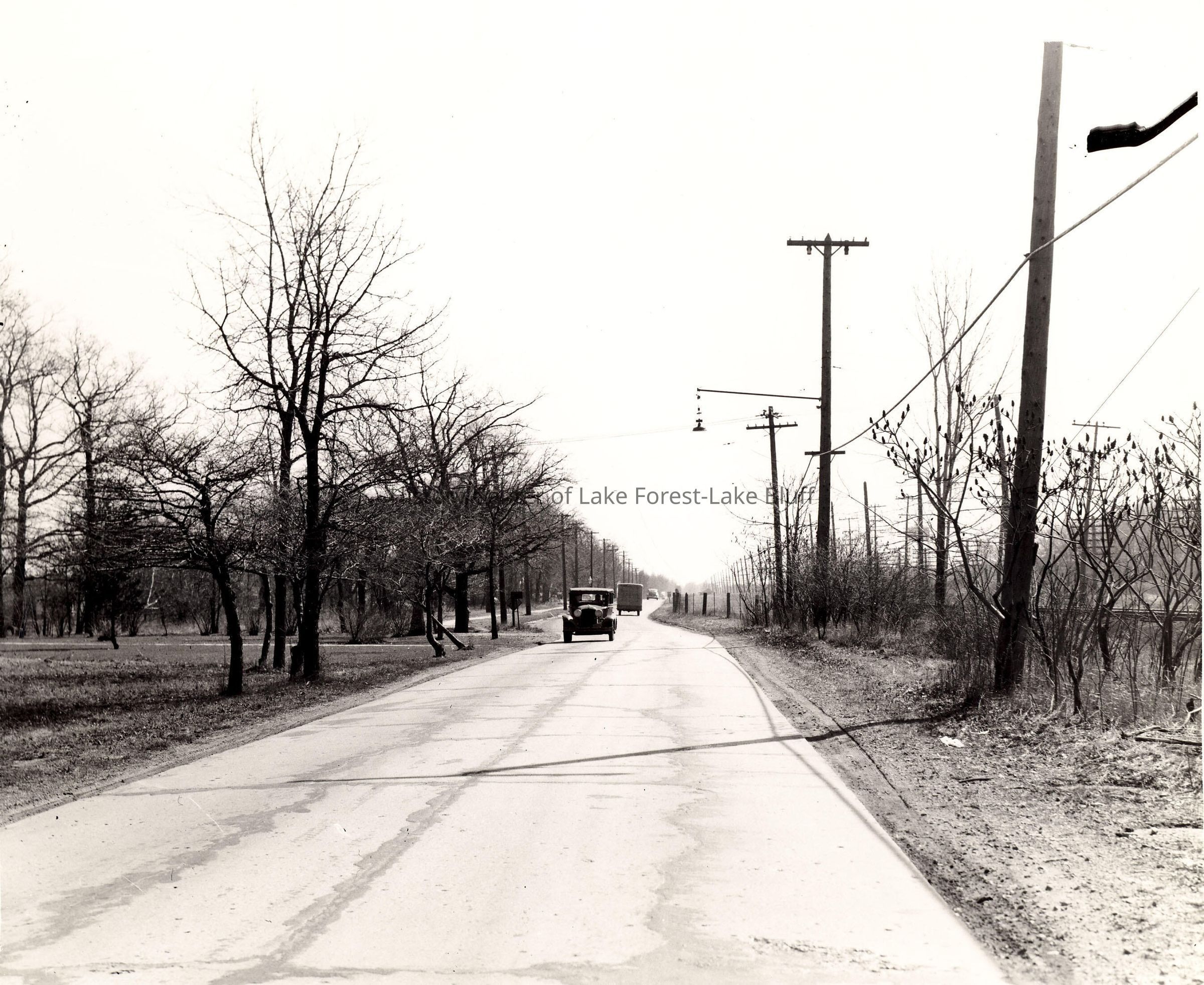 McKinley Road looking south at the northern city limits, the border with Lake Bluff. 1930s-1940s. North Shore Line (interurban) tracks at right.
