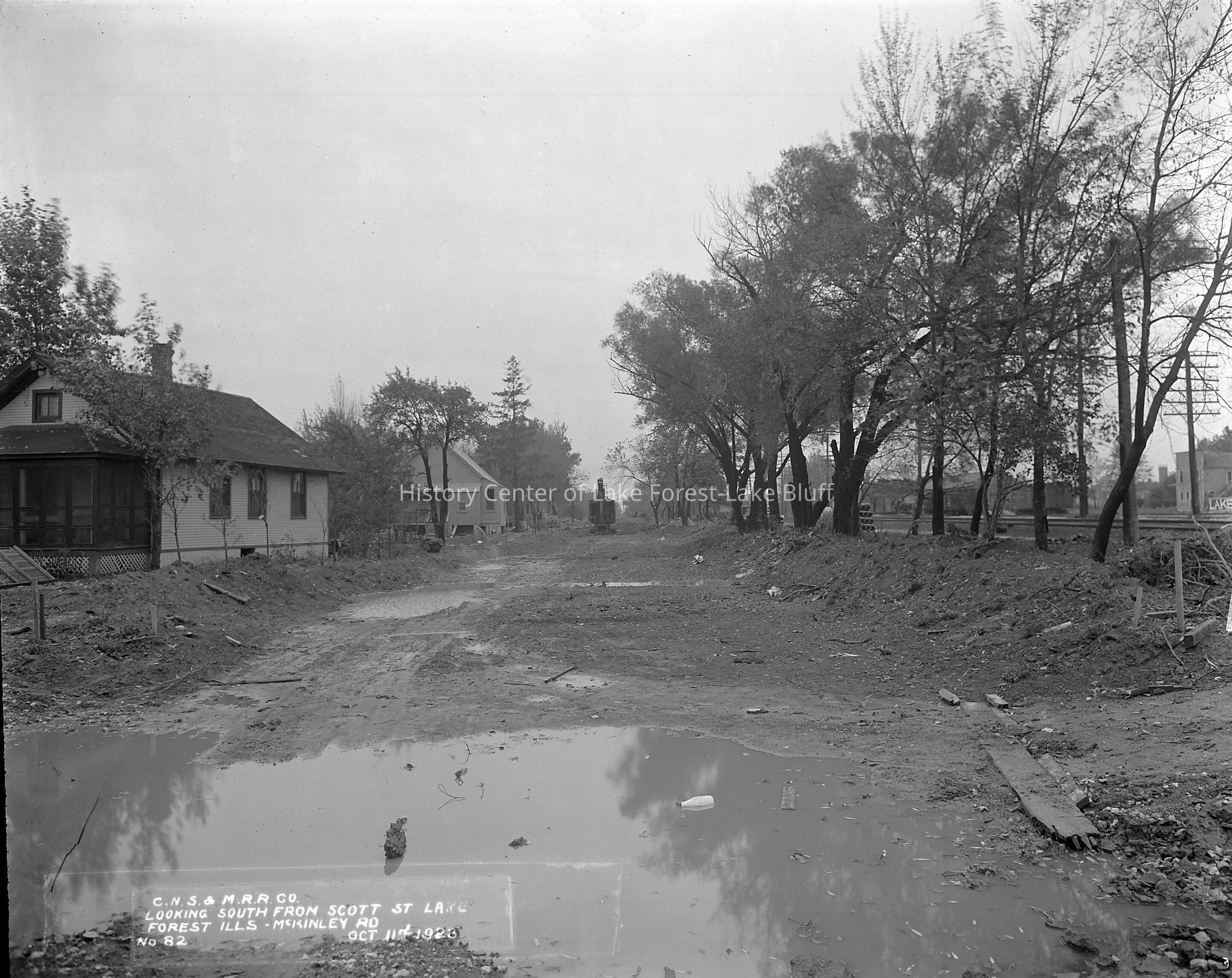 Chicago, North Shore & Milwaukee Railroad McKinley Road looking south from Scott Street in October 1923, construction of the new road is underway. A steam shovel is in the background. Dated October 11, 1923 images are also on a CD (1982.3.1 - 1982.3.29)