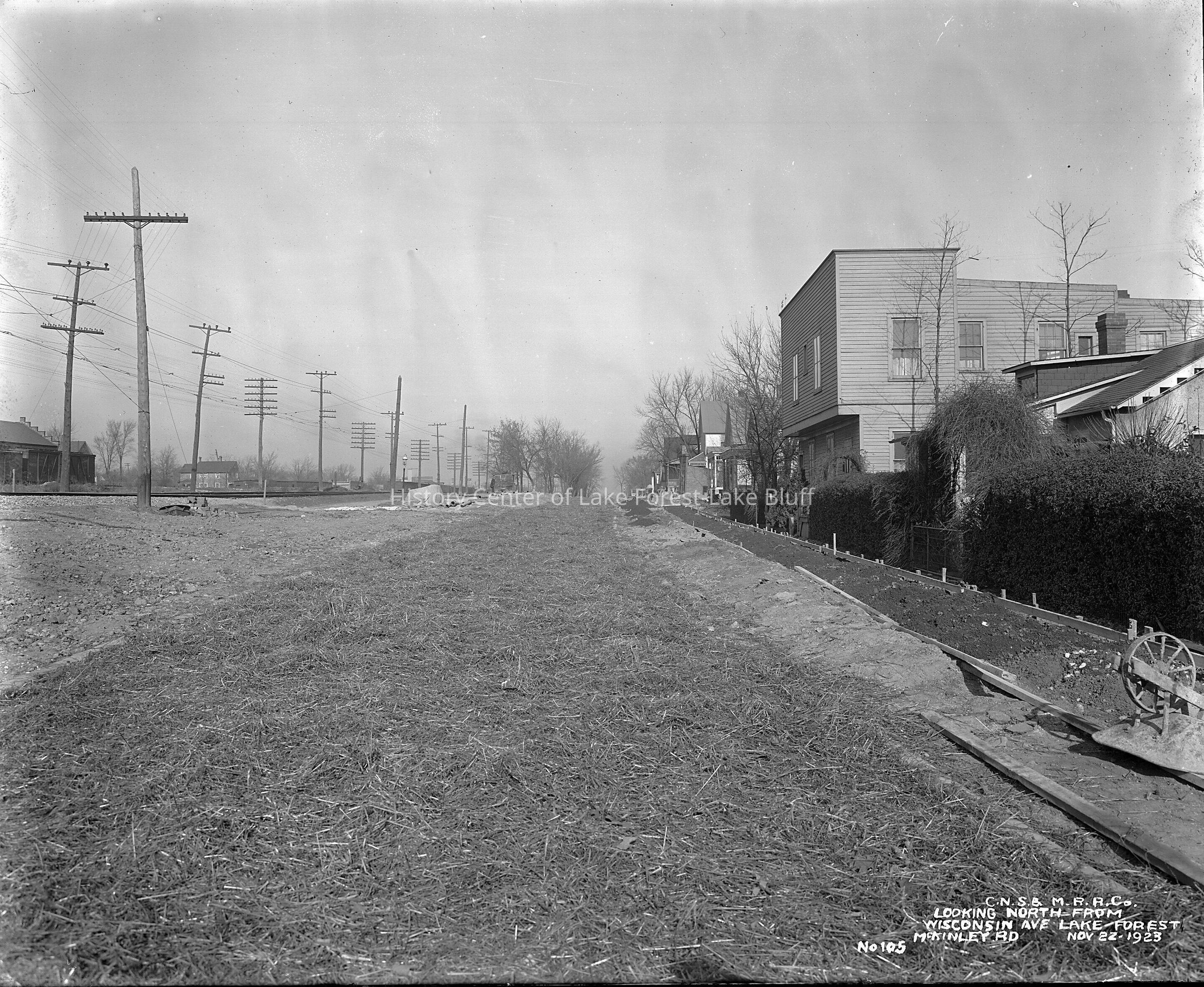 Chicago, North Shore & Milwaukee Railroad At this time in the 1920s McKinley Road north of Wisconsin Avenue was considered to be the industrial district of Lake Forest which commercial businesses of all kinds, some of which were served by the Chicago & North Western railroad. In an attempt to compete for less than carload freight, the North Shore Line tried to build a freight house here; however, the railroad met stiff resistance of the neighbors and was unsuccessful in its efforts. images are also on a CD (1982.3.1 - 1982.3.29)