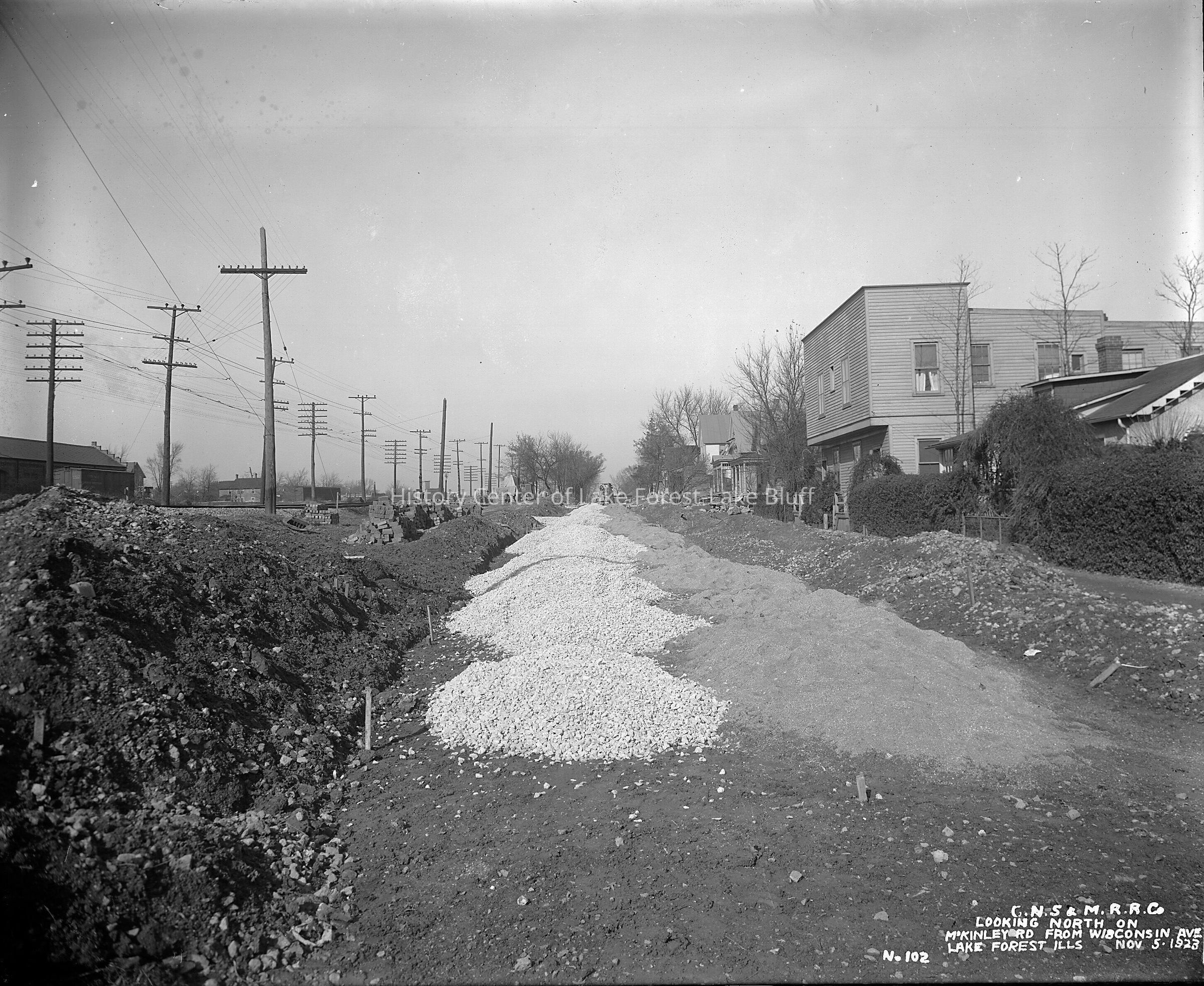 Chicago, North Shore & Milwaukee Railroad Looking north on McKinley Road from Wisconsin Avenue on November 5, 1923. It seems that an unusual amount of dirt is being moved. images are also on a CD (1982.3.1 - 1982.3.29)