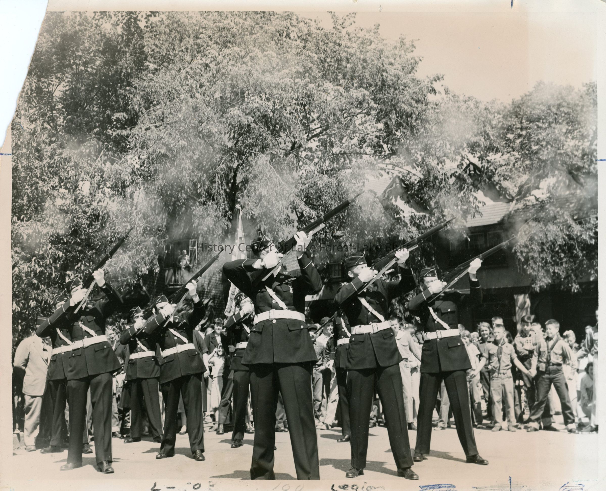 Members of the McKinlock Post 264 fire rifles at a celebration-- possibly memorial day?