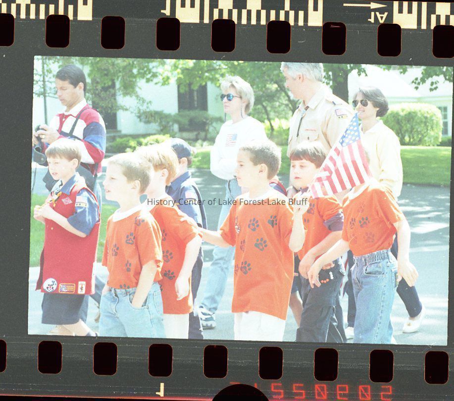 Children in orange shirts and a scout engage in a patriotic parade, accompanied by adults in casual attire.