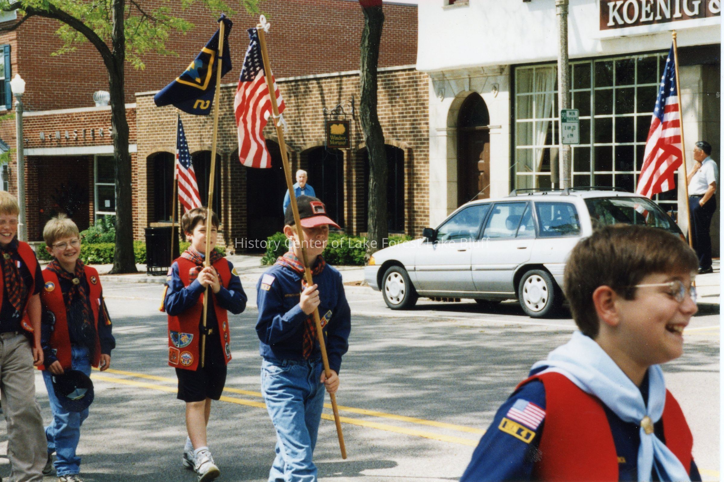 Troop 48 of the Boy Scouts carrying flags at the Lake Forest Memorial Day celebration, 1998. Same as 2024.5.54.