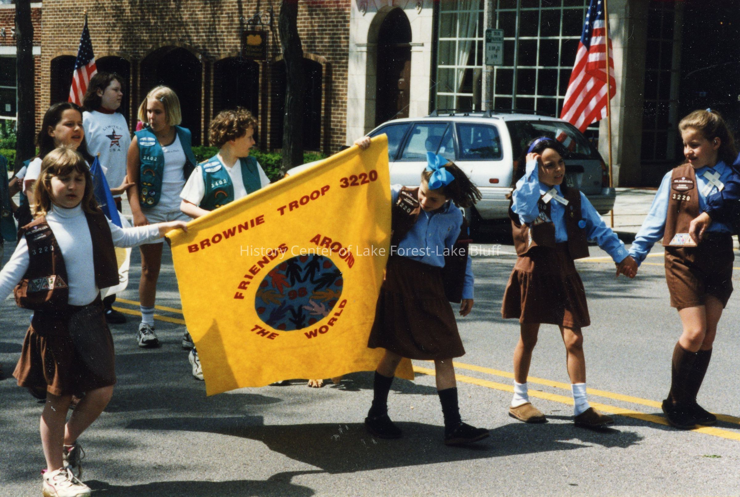 Members of the Girl Scouts Brownie Troop 3220 hold up a banner for their troop in the Lake Forest Memorial Day celebration, 1998.