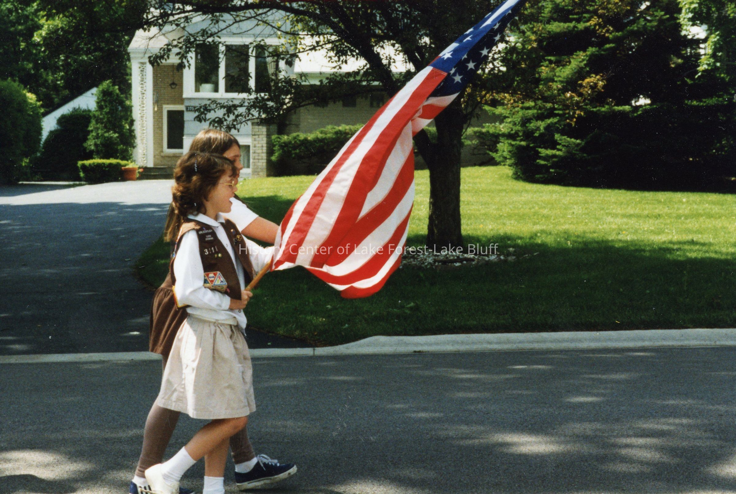 Two young girls in Girl Scout uniforms march holding a large American flag, with a suburban house in the background.