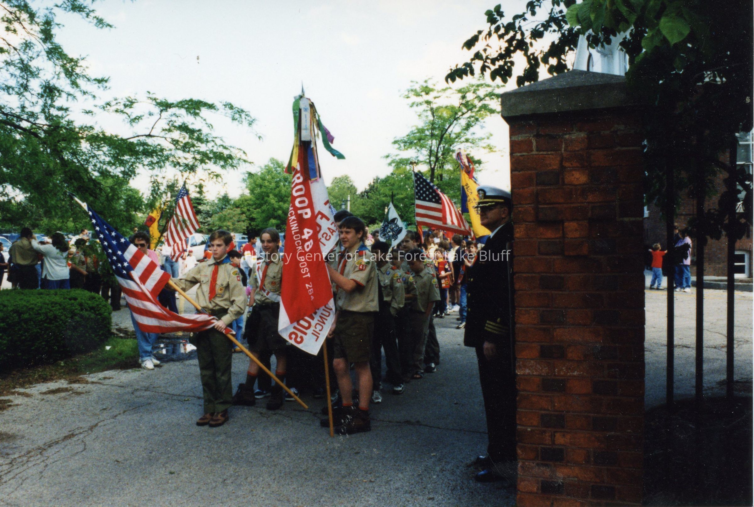 Troop 48 of the Boy Scouts bearing flags at the Lake Forest Memorial Day celebration, 1998.