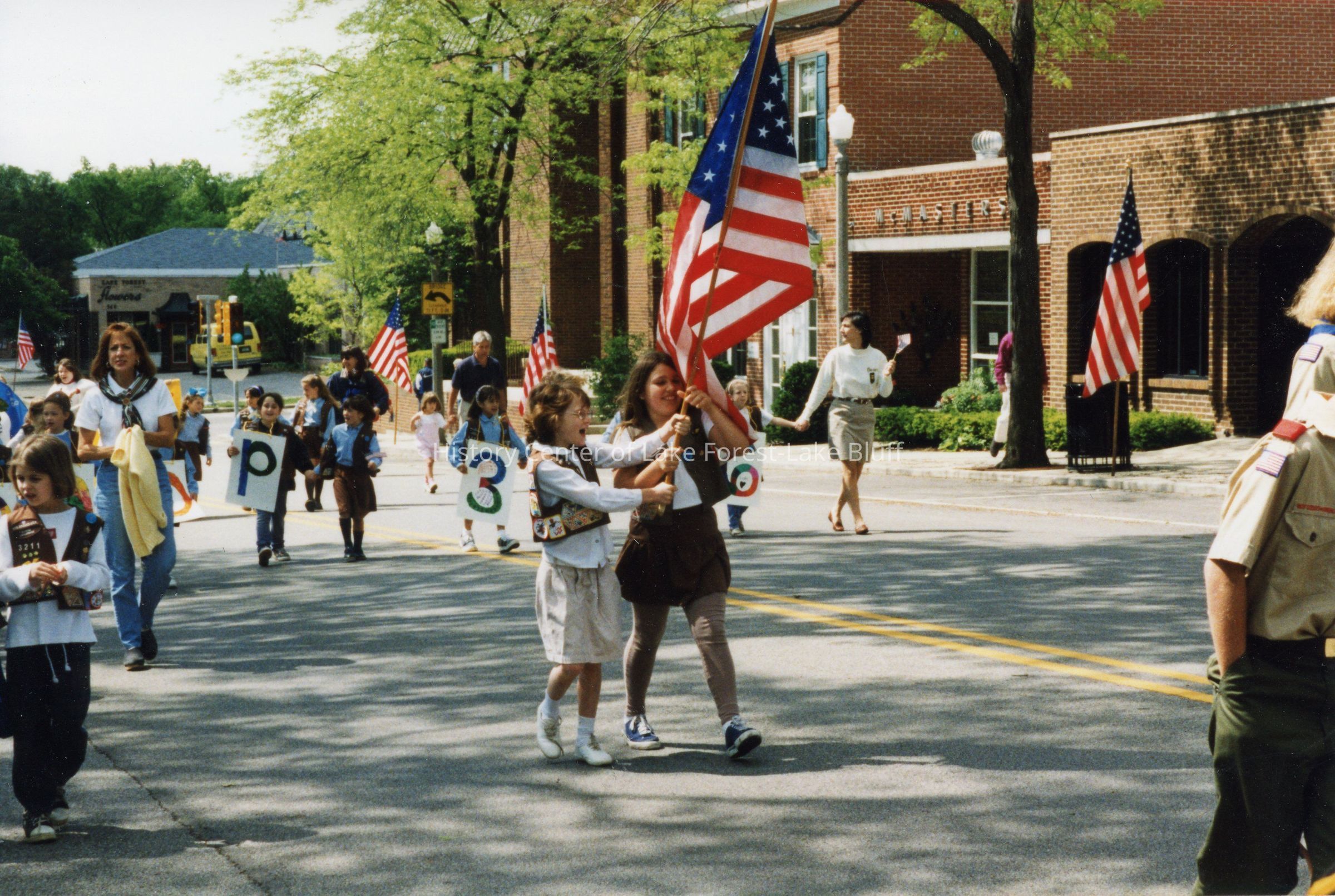 Two Girl Scouts playfully tussle over the American flag, Lake Forest Memorial Day celebration, 1998.