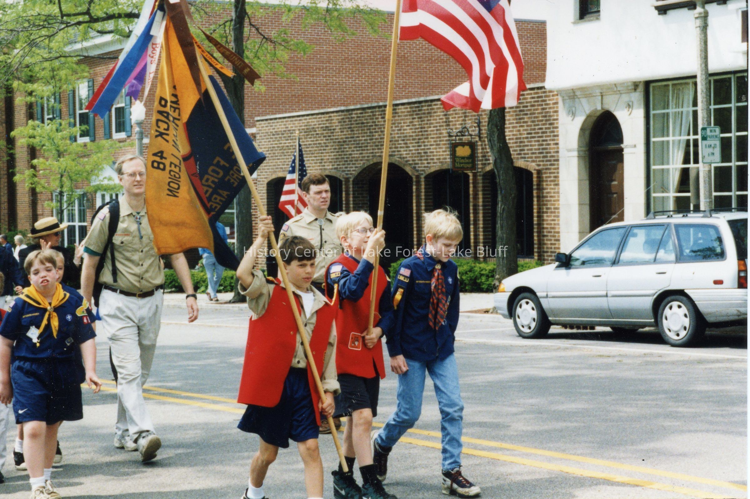 Troop 48 of the Boy Scouts bearing flags at the Lake Forest Memorial Day celebration, 1998. Identical to 2024.5.50.