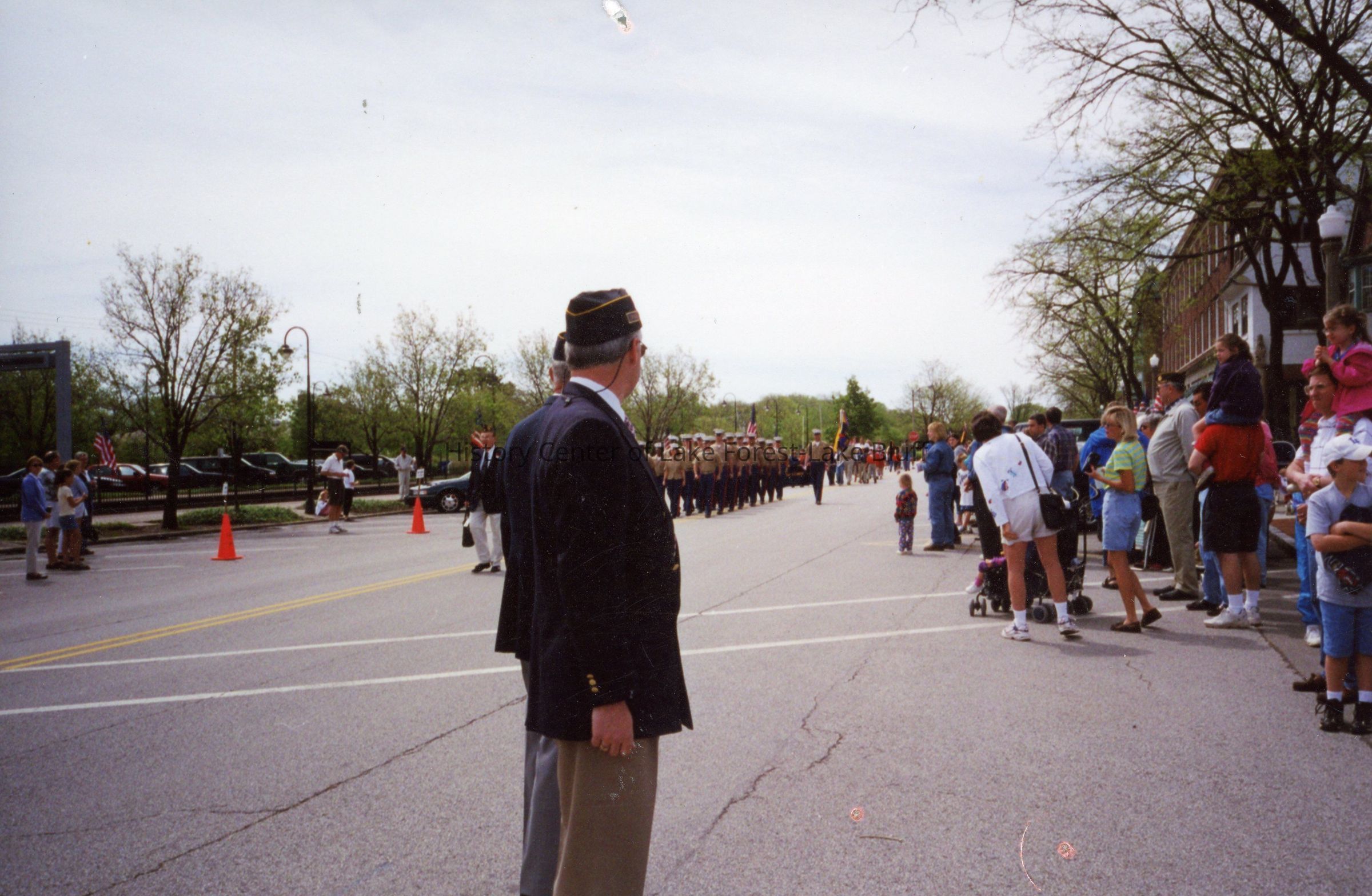Members of the McKinlock Post 264 watch the Marines march in the Memorial Day parade, 2001.