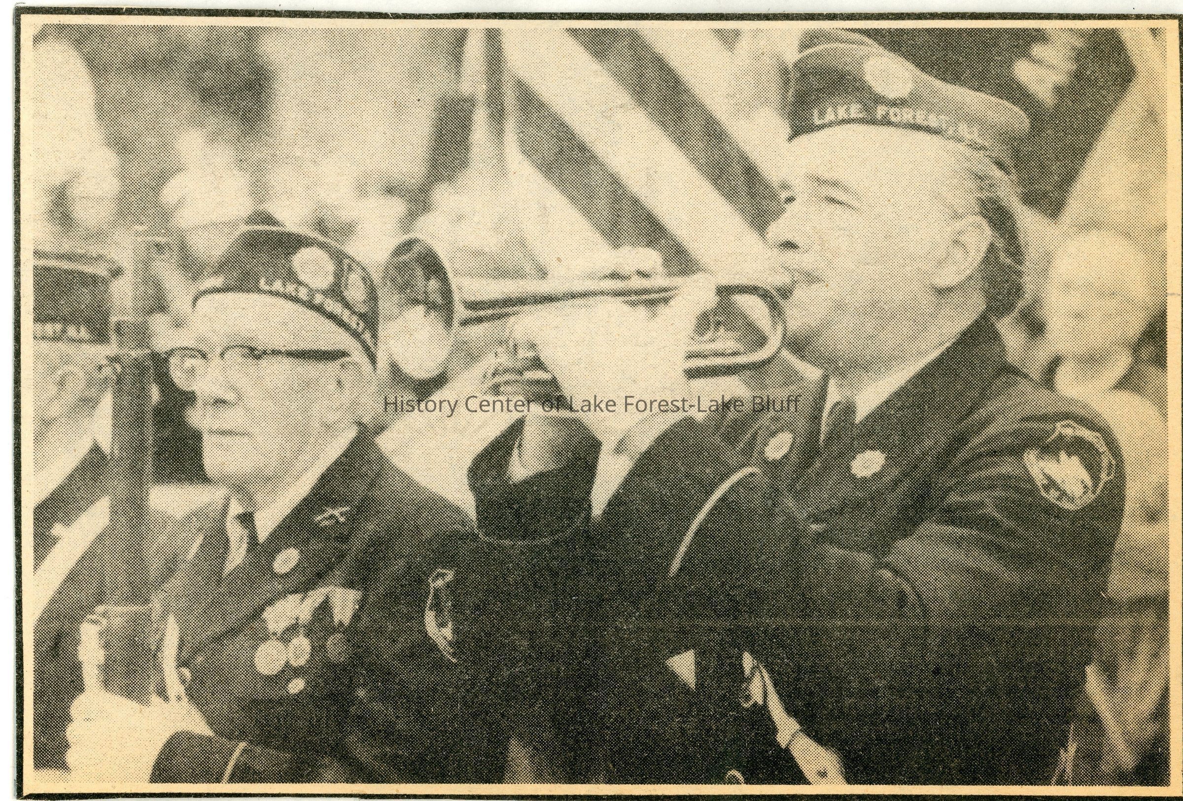 Photo taken from a newspaper. Typed caption: "Roy Moller will sound Taps on Memorial Day-- as he has done annually since joining McKinlock Post in 2950-- and as a youngster prior. (An earlier photo of Roy with his late father, Sven Moller)."Photograph Details