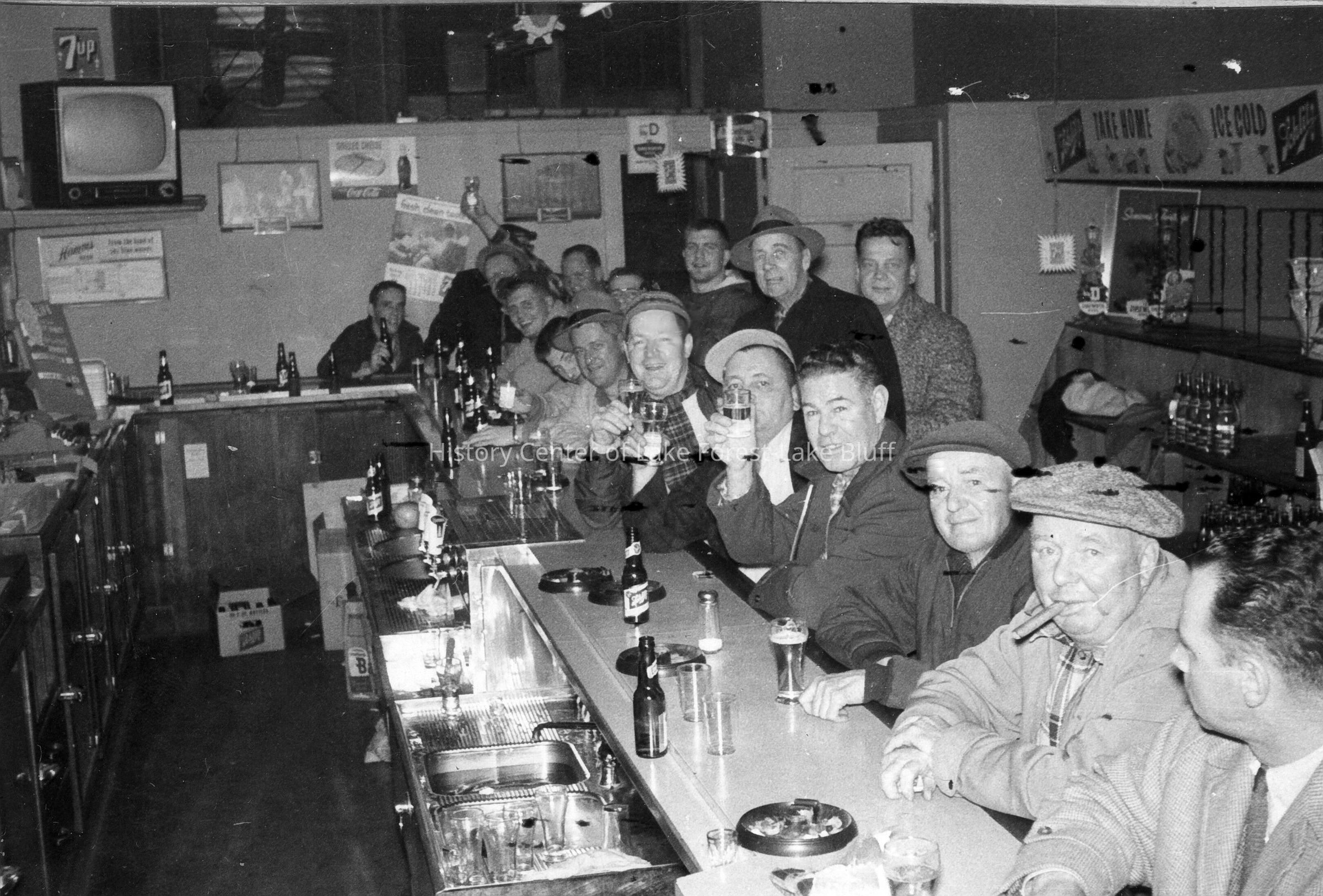 Dave Yore is sitting at left, holding a bottle; Bill Johnson is seated third from left; Ronnie Johnson (left of man standing wearing a hat); "Mac" McCracken, 7th from front/right, seated in hat; Sandy McKillop seated at right with cigar; possibly Bill O'Neill, right front with head turned.Lexicon