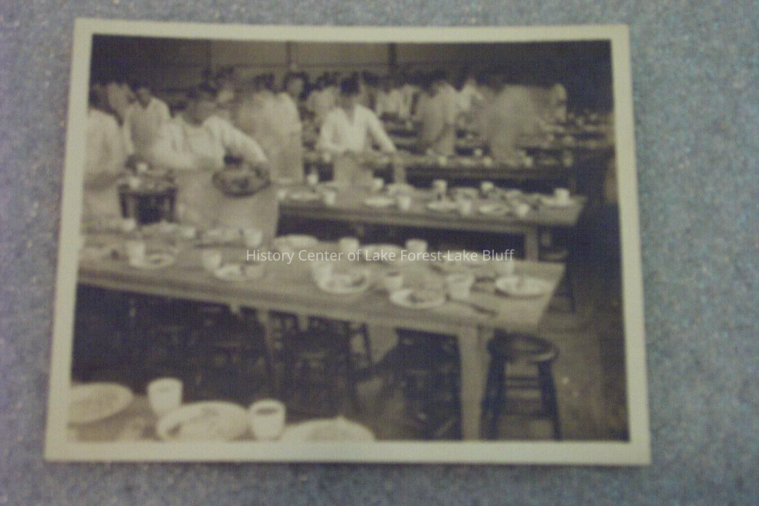 Cafeteria seating area or mess hall with men serving individual portions on to plates.