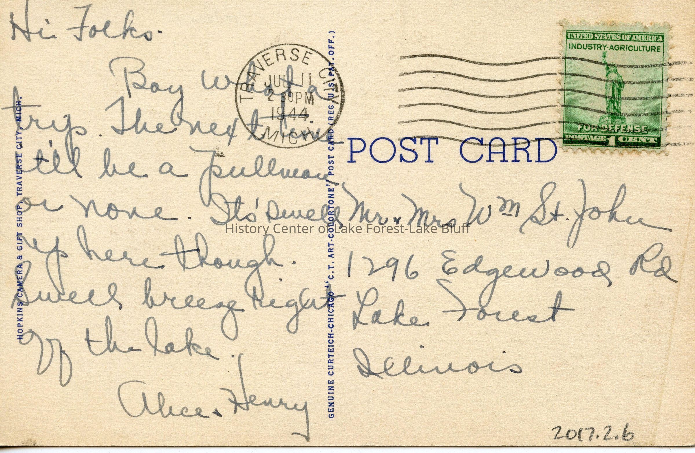 postcard to Mr. and Mrs. William St. John at 1296 Edgewood Road from Alice and Henry
