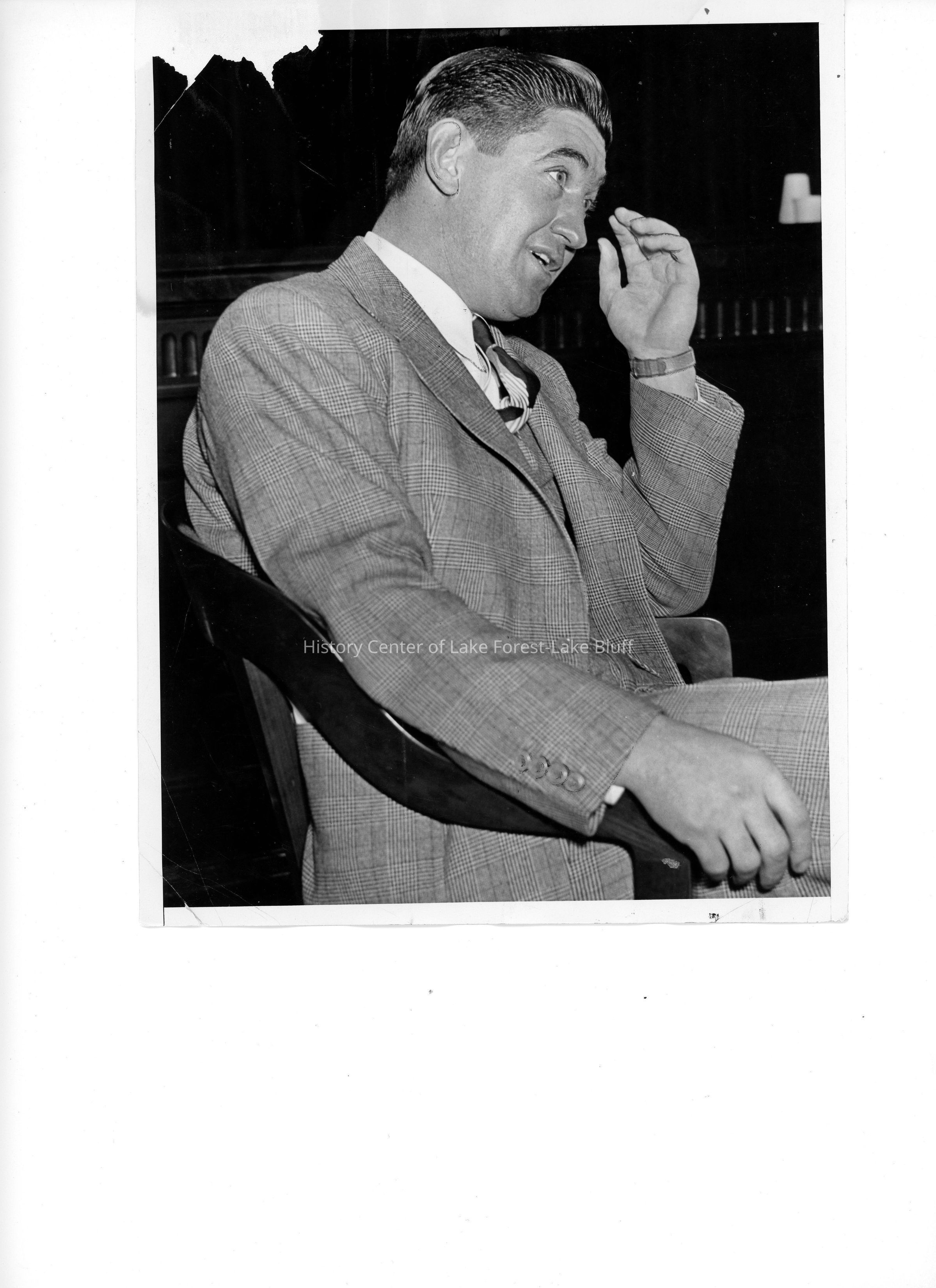 "Cochrane catches some fast ones: Mickey Cochrane, manager of the Detroit Tigers, pictured on the witness stand before the securities exchange commission Feb, 17. Cochrane was summoned to testify on stock manipulation charges against W.E. Hutton Company of New York. Cochrane was questioned about 1,000 snares of Atlas Tack stock which was purchased for him by a Hutton Employee. Cochrane told reporters, 'I didn't like that sort of questioning much. You can't tell when those lawyers are going to throw a hook at you. They've got a lot of stuff on the ball.'"