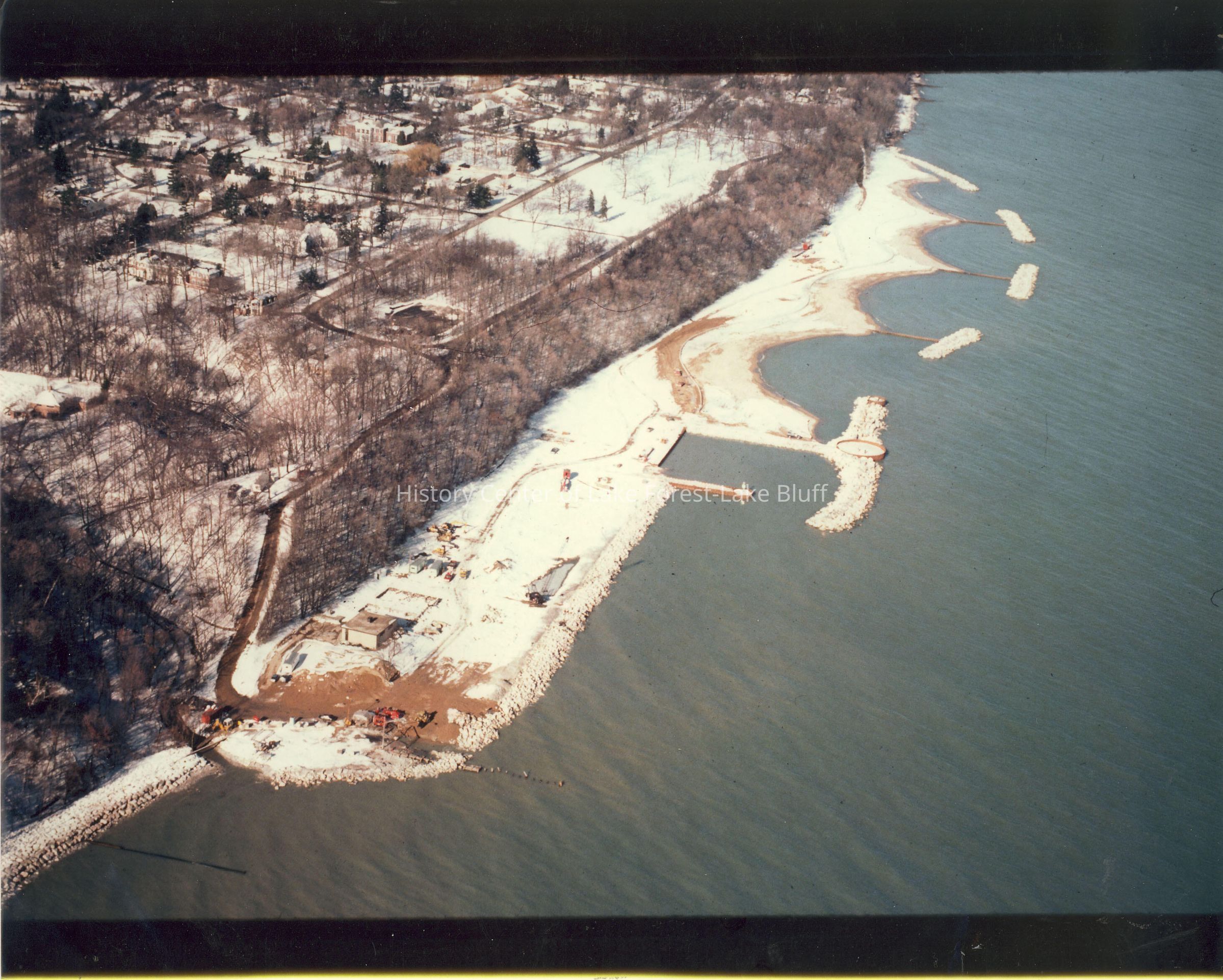 8x10- aerial shot of the lakefront - Lake Forest beach, winter time, snow covering the ground; on the back of the photo it says: 'front cover II'