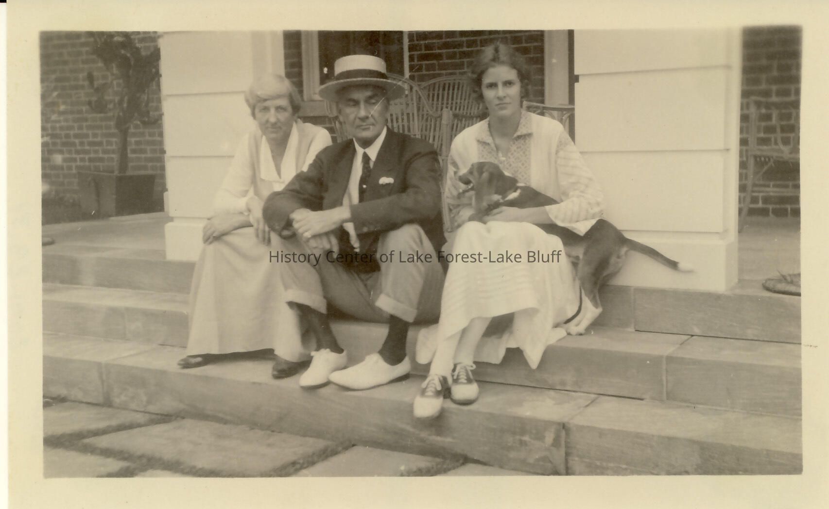 Miss Harriet Smart (Baba - Grace's nurse), Robert McGann, and Grace McGann sitting on steps. Grace is holding a dog. Fairlawn - 965 E. Deerpath.