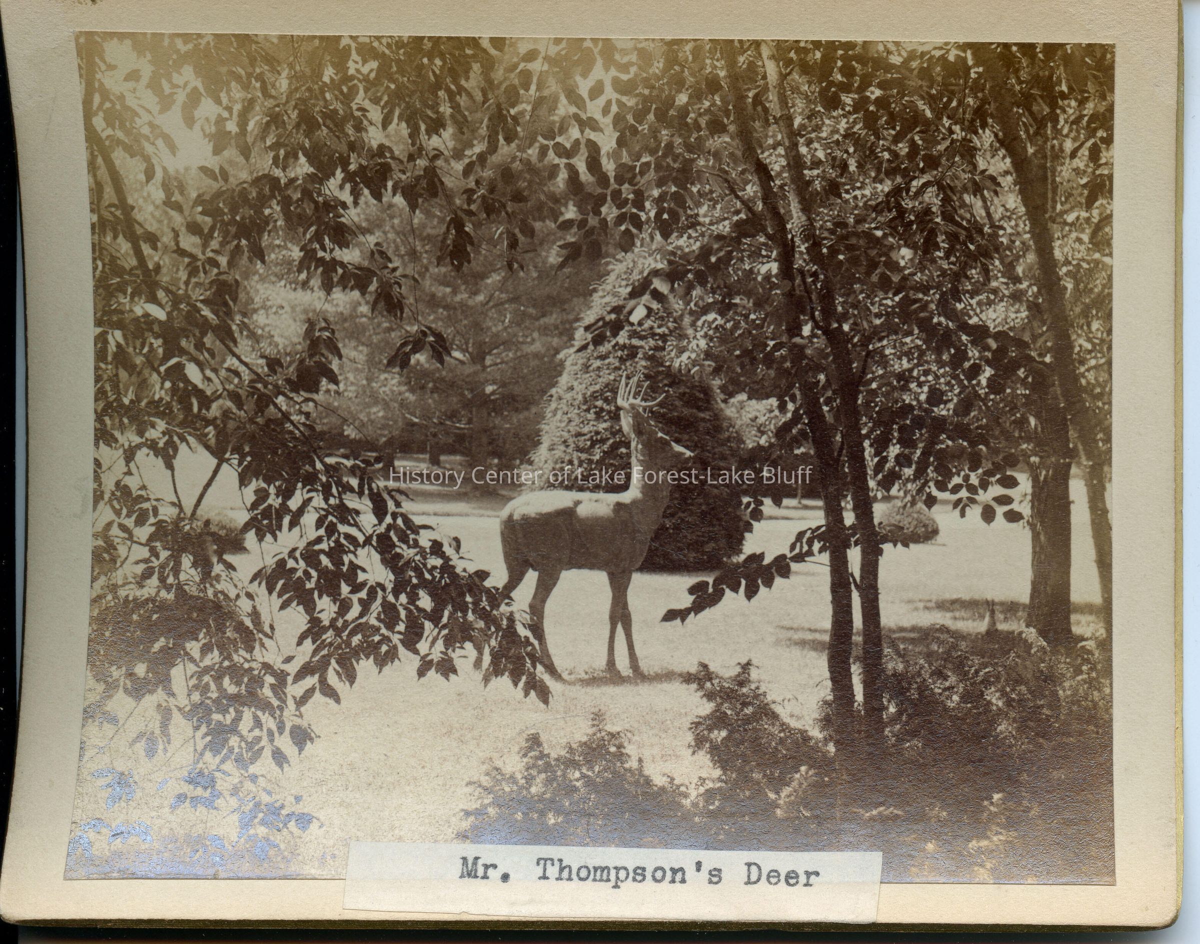 Photograph of Mr. Thompson's Deer statue. "Holt" and "1878" written on back. May be from Holt family.