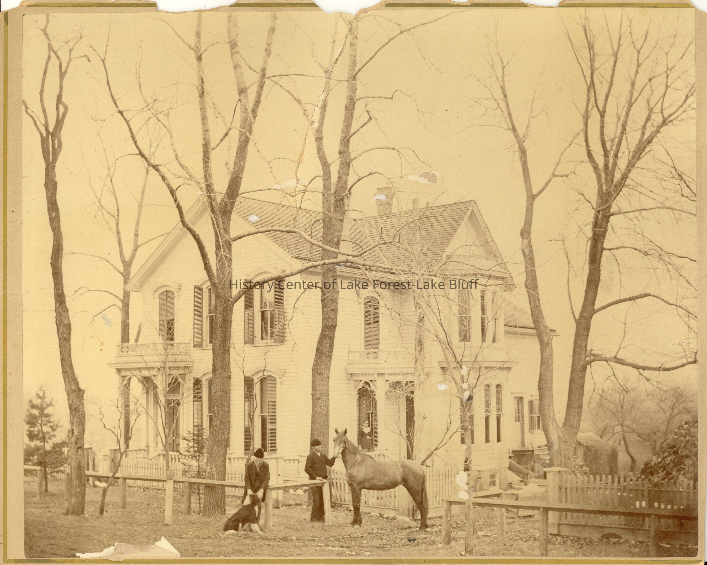 Mrs. Charlie Pratt's House (Patrick Goodwin). Her mother and father standing with horse and dog, Mrs. Pratt on porch. Horse was Polly who for many years pulled the first laundry wagon in Lake Forest. 360 East Westminster, Lake Forest, b. 1876 by Howard Van Doren Shaw.