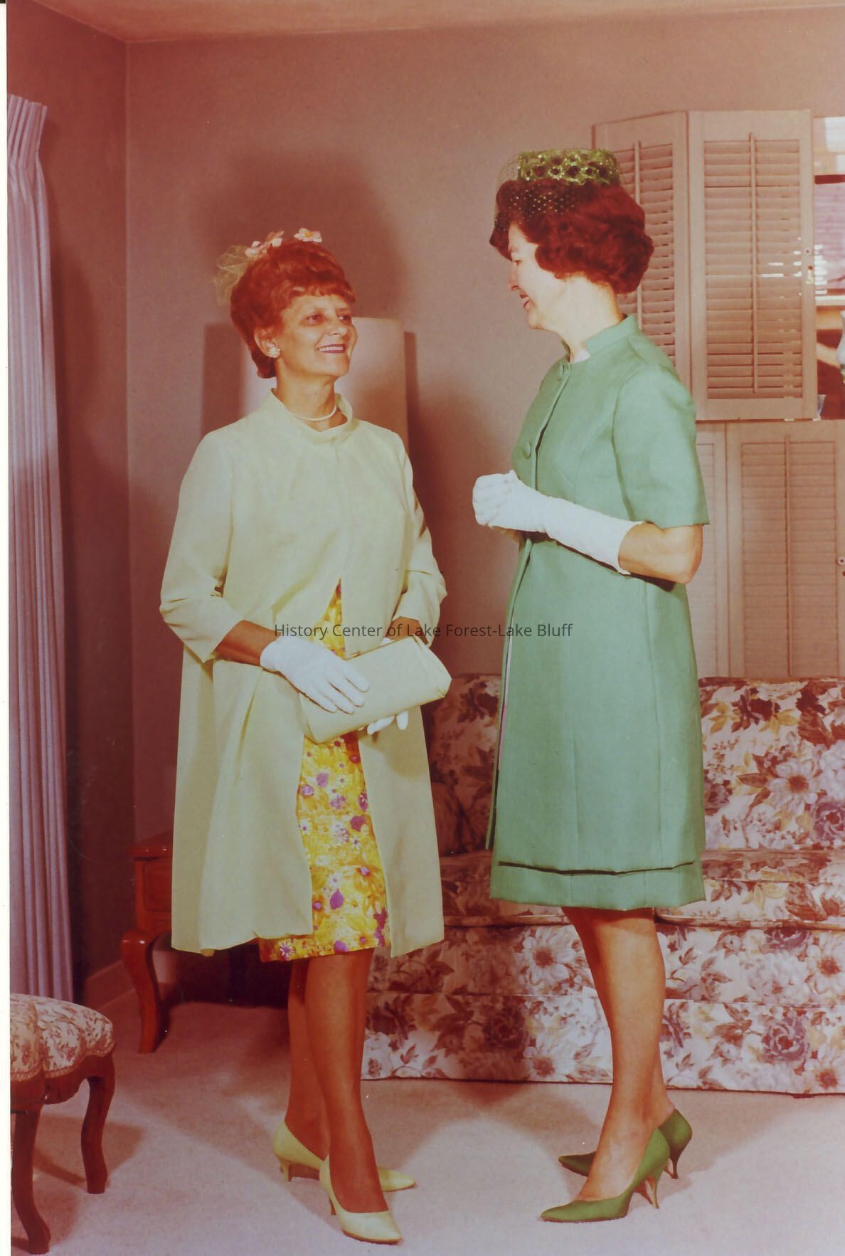 Woman on left in light green with yellow print underdress with purse is Mrs. Joseph Matulenas, on right in darker green is Virginia Fiester (designer)