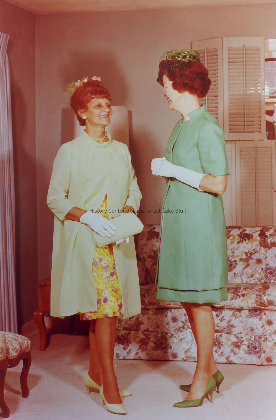 Woman on left in light green with yellow print underdress with purse is Mrs. Joseph Matulenas, on right in darker green is Virginia Fiester (designer)