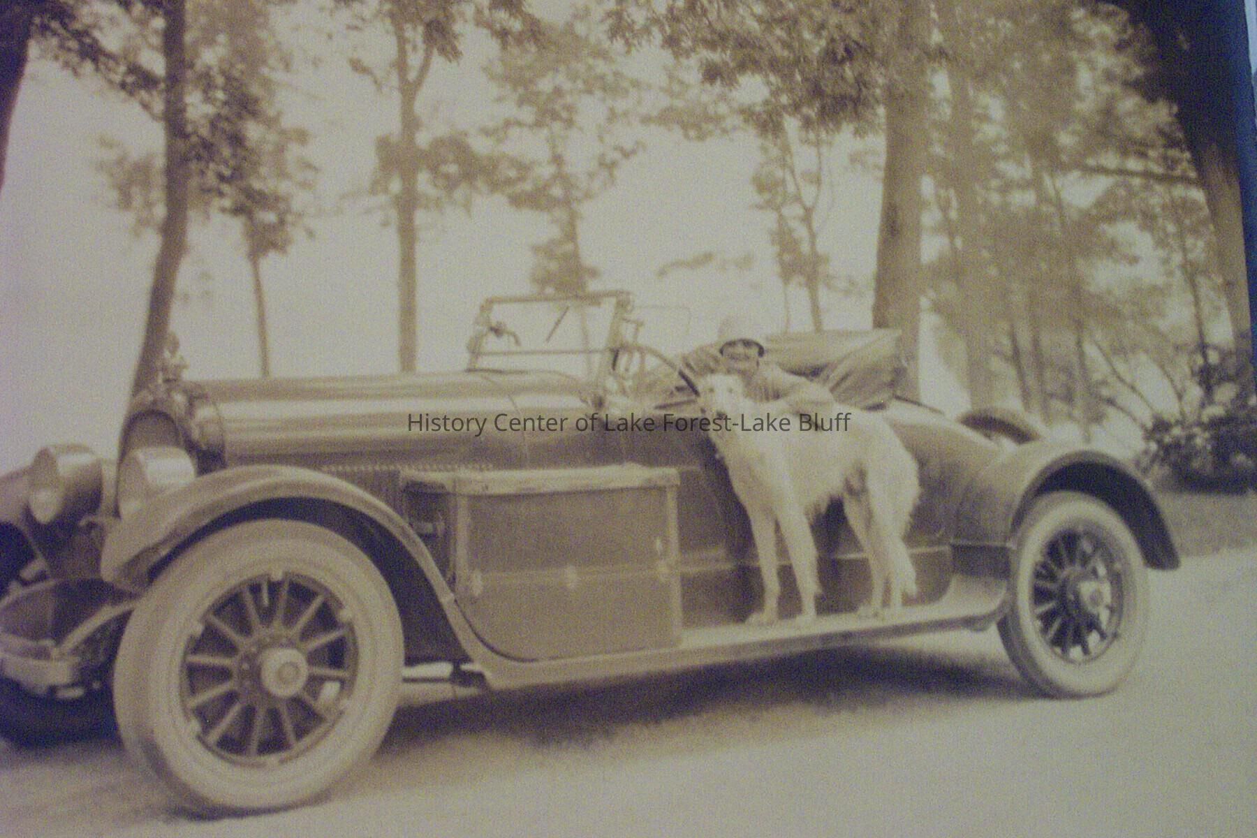 Portrait of Mrs. Sidney Smith sitting in a car with dog on the runner board at Lake Geneva
