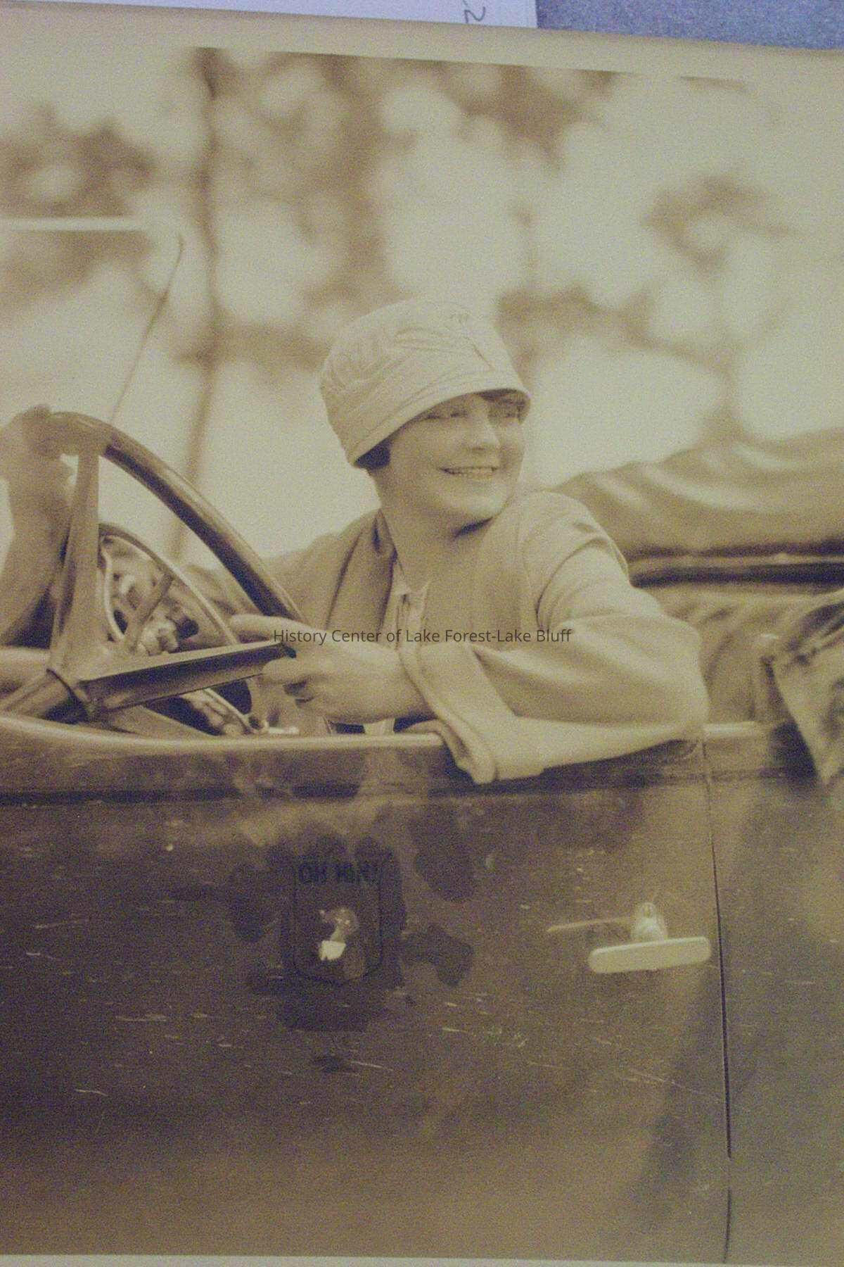 Portrait of Mrs. Sidney Smith behind wheel of car wearing hat and coat on the car door, is an emblem, with the words "Oh Min!"