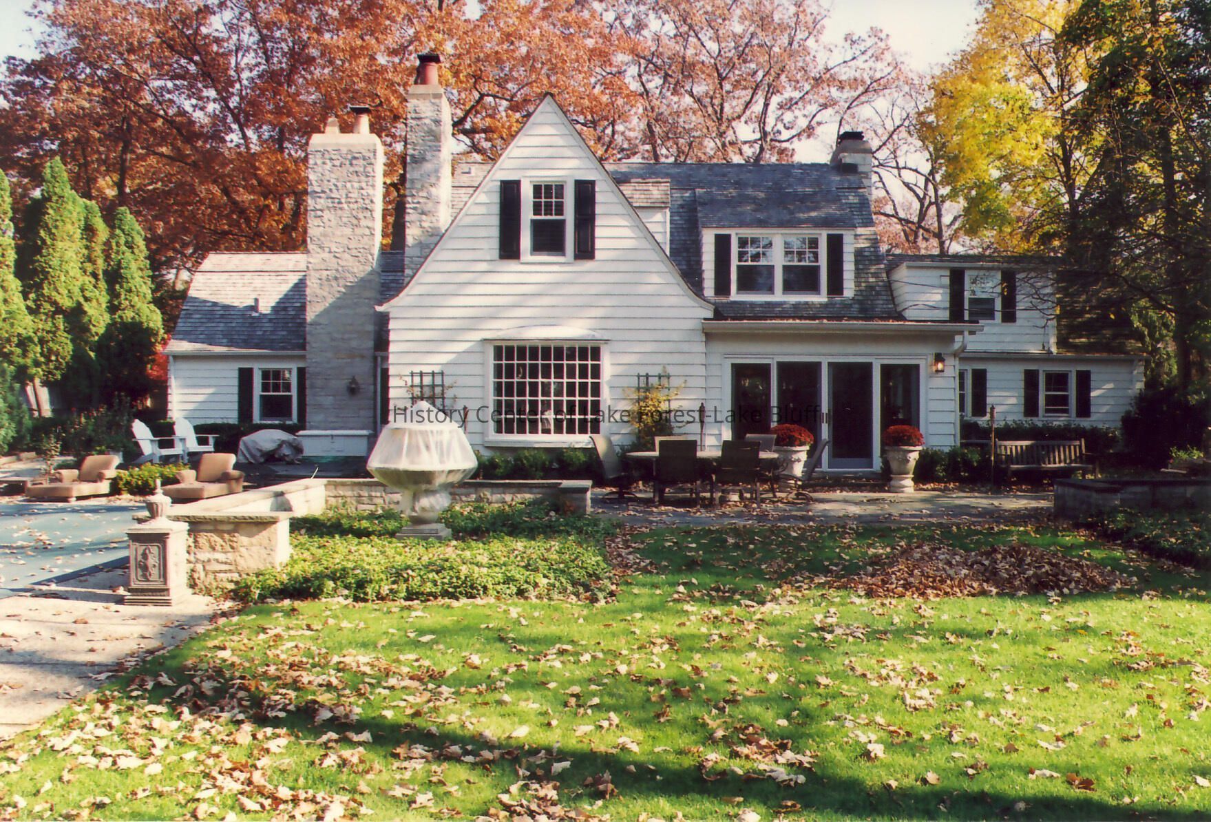 Rear exterior of Walter Frazier home built for Mrs. William H. Hubbard in 1927. Located at 1090 Edgewood Road in Lake Forest, Illinois.
