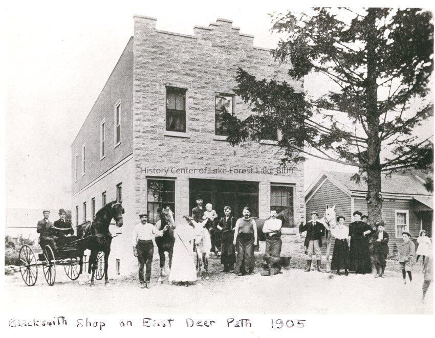 Blacksmith Shop - 179 East Deerpath; dated 1905, includes a slide (dated Sept. 1984) and print of image. Names written on back of photo include: William Heaney, Joseph Carrol, Thomas Carrol, Mrs. Allen Murrie, Allen Murrie, Richard Murrie (son), Clifford Murrie, John Gault, William McHattie, Helen Murrie Tibbetts, Mrs. William Kennedy and Raymond Murphy. Also, written on back of photo, "Compliments of AE Murrie Horseshoes"Lexicon