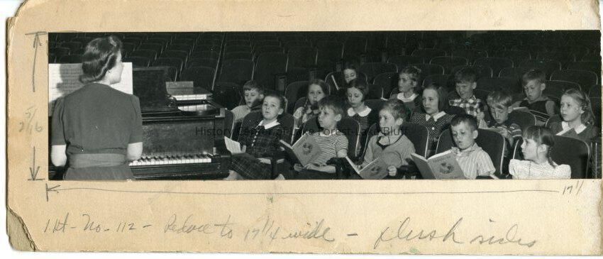 Children with songbooks and teacher at piano in an auditorium. Pasted on cardboard with editing notes and marks. Names written on back: Sally Watson, Linnea, Anderson, Carter Wamboldt. See also 2001.119.14. Could be Gorton School.