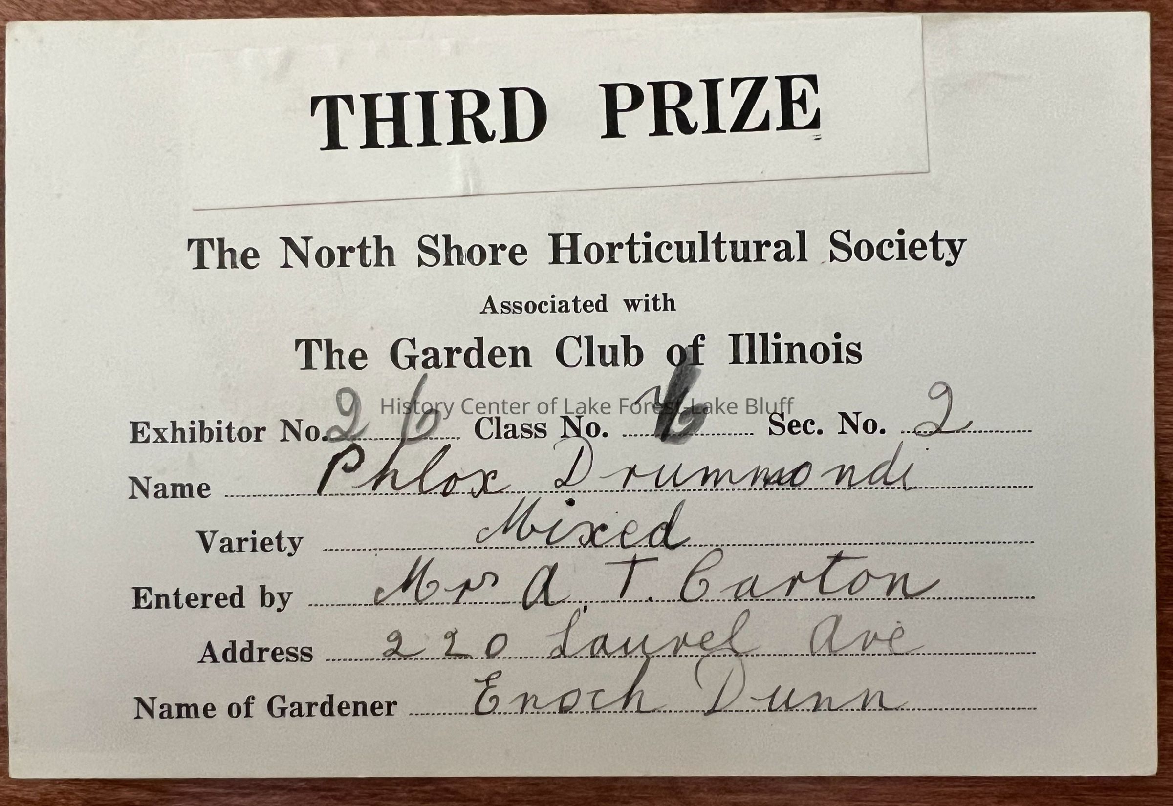 North Shore Horticultural Society third prize award for Phlox Drummondi, Gardener Enoch Dunn, entered by Mrs Alfred T. Carton at 220 Laurel Avenue (now 6 East Laurel)Context