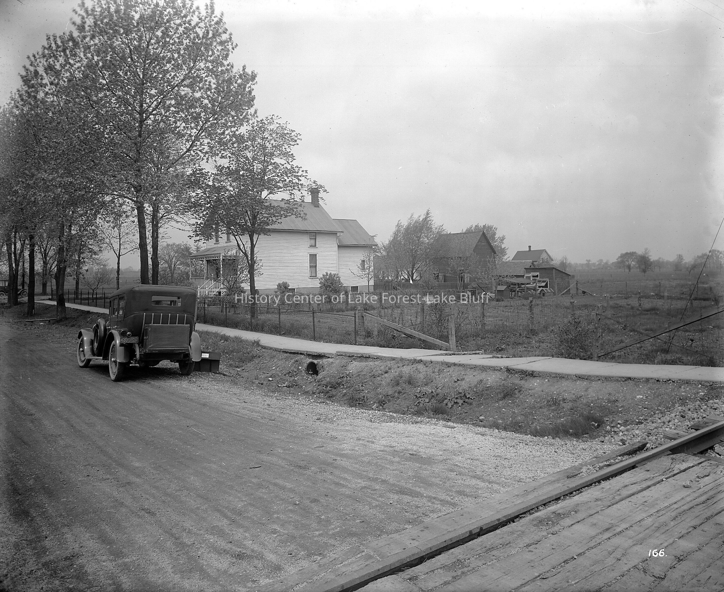 Chicago, North Shore & Milwaukee Railroad According to North Shore Line historian Norm Carlson, "We believe that this is the photographer, Albert F. Scholz Sr's, automobile parked in Lake Bluff on May 27, 1924. The box sitting next to the car is the key - Scholz used glass plates as negatives and a large box was needed to transport them." images are also on a CD (1982.3.1 - 1982.3.29) Possibly Route 176 near Rondout.