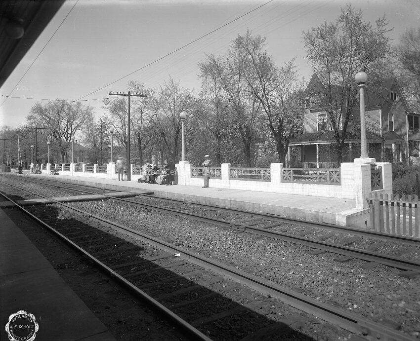 Chicago, North Shore & Milwaukee Railroad. Circa 1924 the photographer is standing on the southbound platform of the Lake Forest station looking northeast at the northbound platform of the Shore Line Route. The platform ran along the west side of McKinley Road south from Deerpath Road. images are also on a CD (1982.3.1 - 1982.3.29)