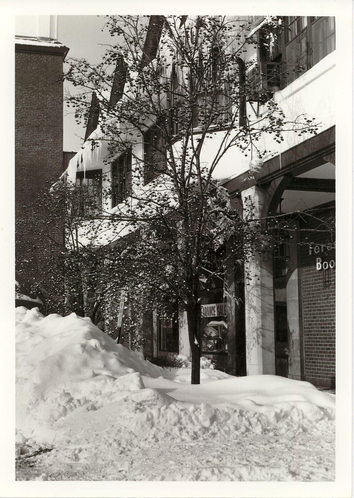 Photograph of the North side of Market Square under heavy snow, taken after the blizzard of January, 1979. Forest Bootery can be seen on the right.