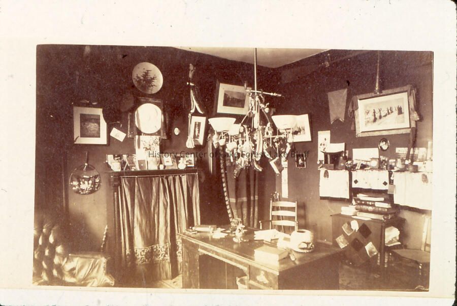 Unidentified interior room, with desk, photographs on walls, etc.