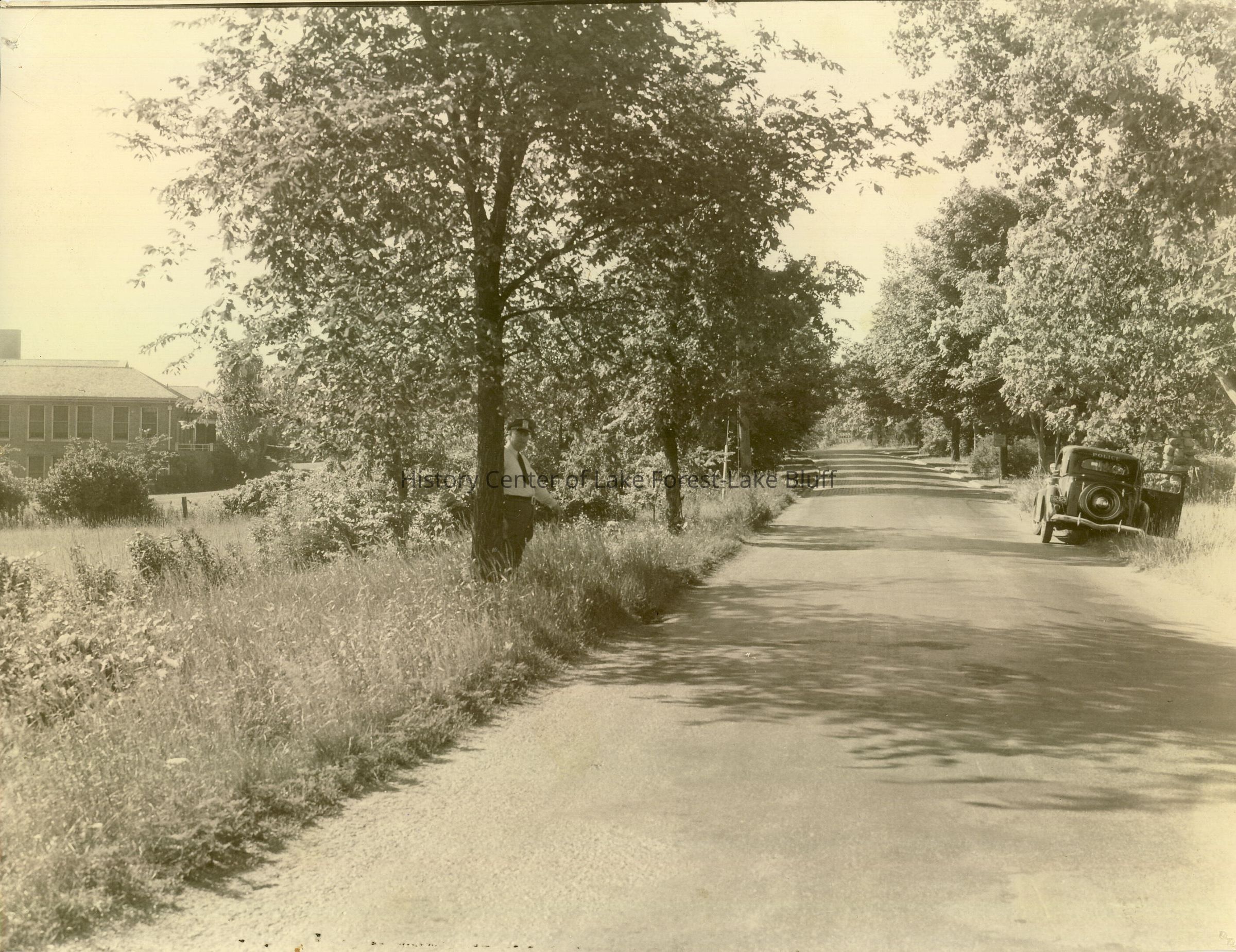 Lake Forest police officer Paul Jensen, standing on the side of an unidentified road. Possibly Green Bay Road, near the current location of Lake Forest Country Day School. He may be pointing at something. A police car is parked on the other side of the road.
