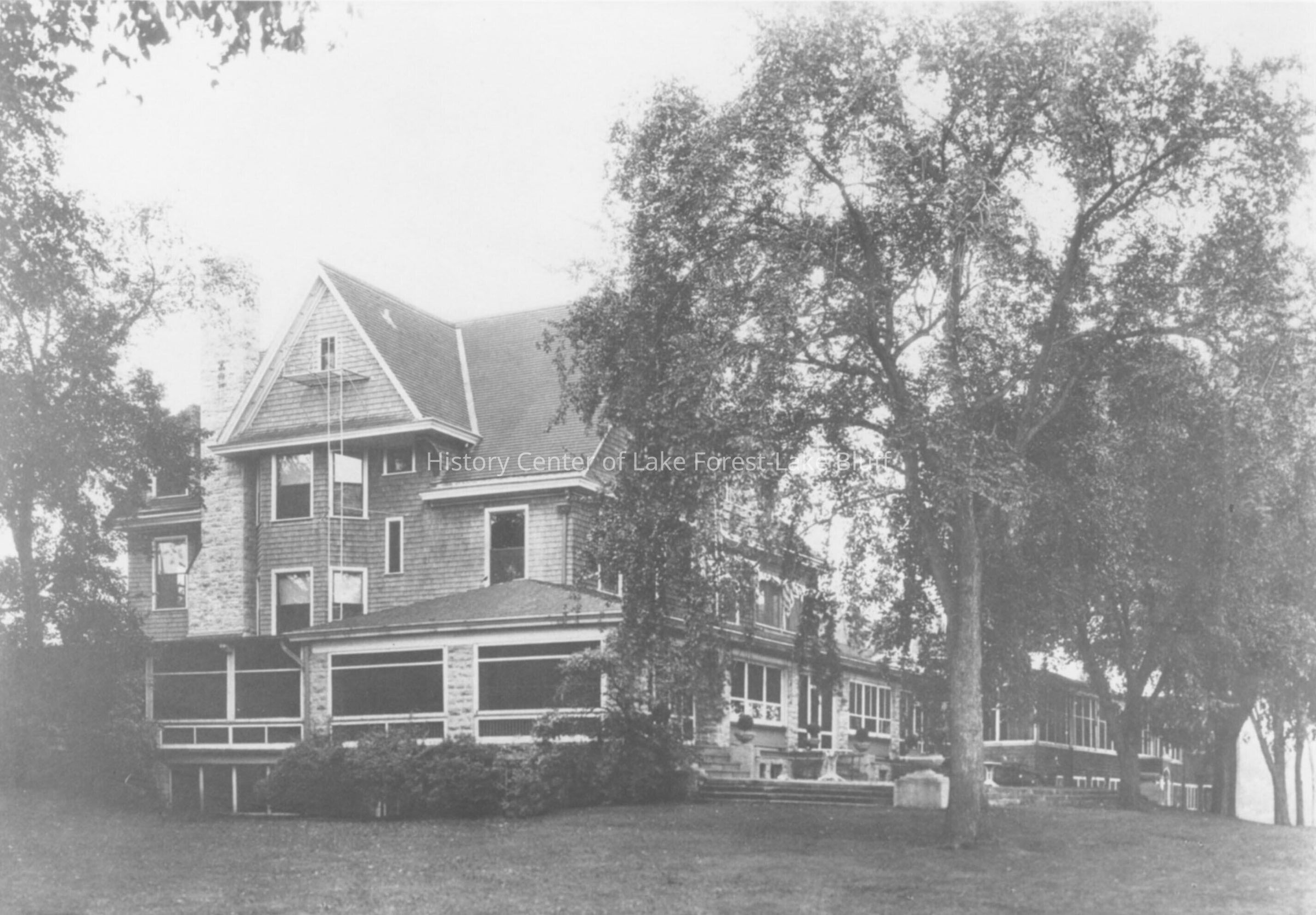 black and white reprint? of period image of Onwentsia Club -West side of the building. Shingle style three story building. formerly Henry Ives Cobb home