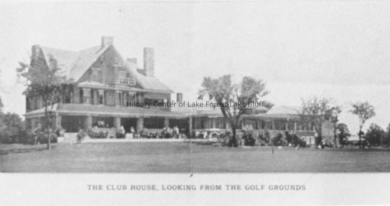 Contemporary black and white reprint of period postcard. Onwentsia Club - Henry Ives Cobb clubhouse looking from the golf grounds. Circa 1900.