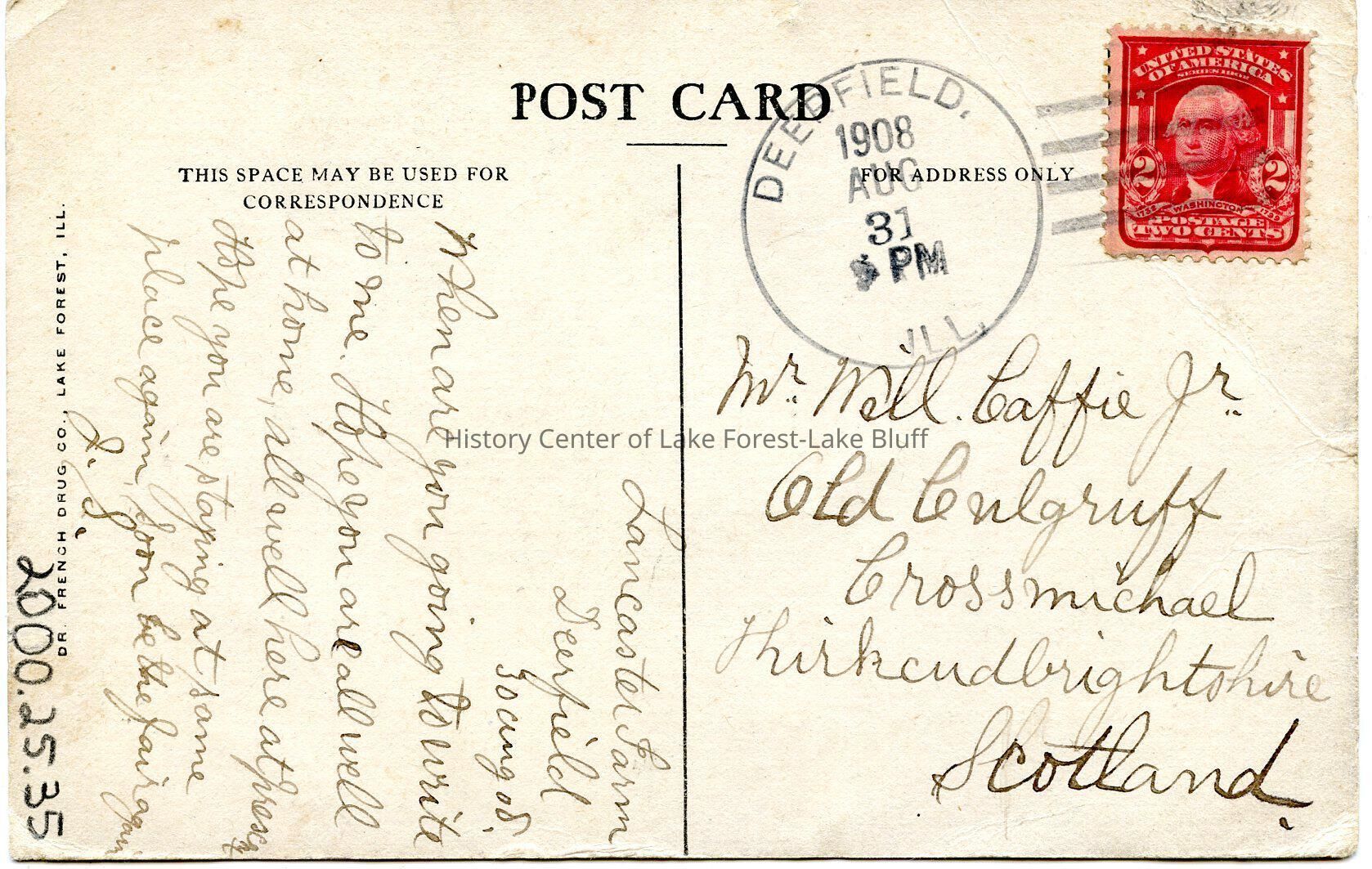 "Onwentsia Club, Lake Forest, ILL." The photo shows the clubhouse and some of the grounds. Verso: 2 cent postage stamp. Sent from Deerfield, IL. The postcard also mentions Lancanster Farm. Sent from Janet Sneddon to a Mr. Caffie Jr. of Scotland. postmark August 31, 1908.Made/Created