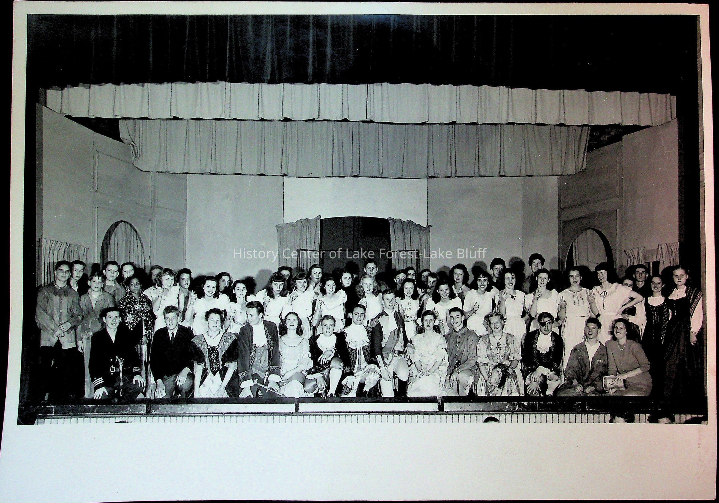 Unlabeled group photo. Probably a group photo of crew and cast members of an operetta produced by Lake Forest High School students. There is a note on the back saying that the photo is owned by Lawrence Crone.