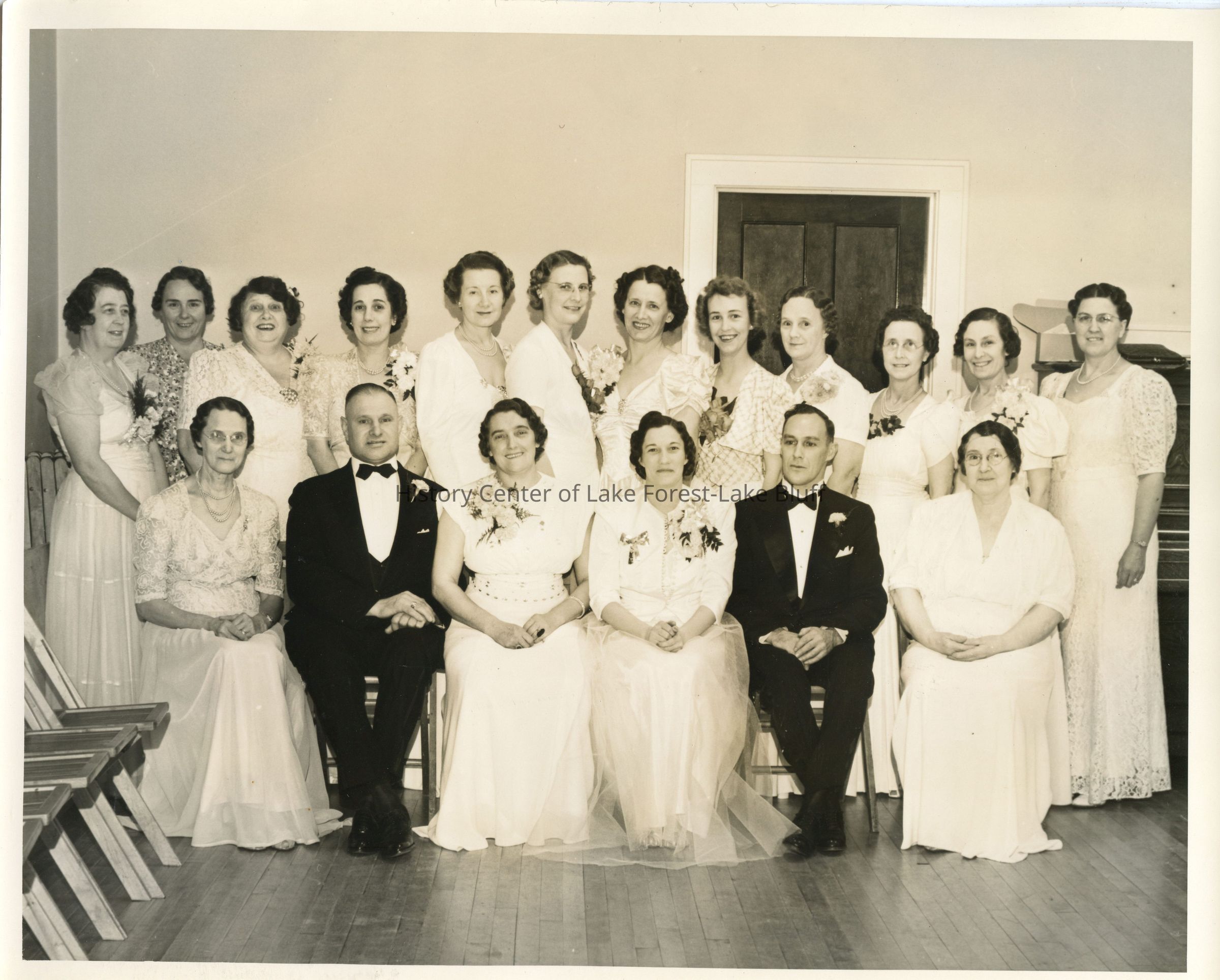 Black and white posed photograph of 16 women who were members of the Order of the Eastern Star. Women are all in white, formal dresses. Two men in tuxedos are also pictured. Mathilda Zieman Greene is in the front row, third from right. 4 copies.