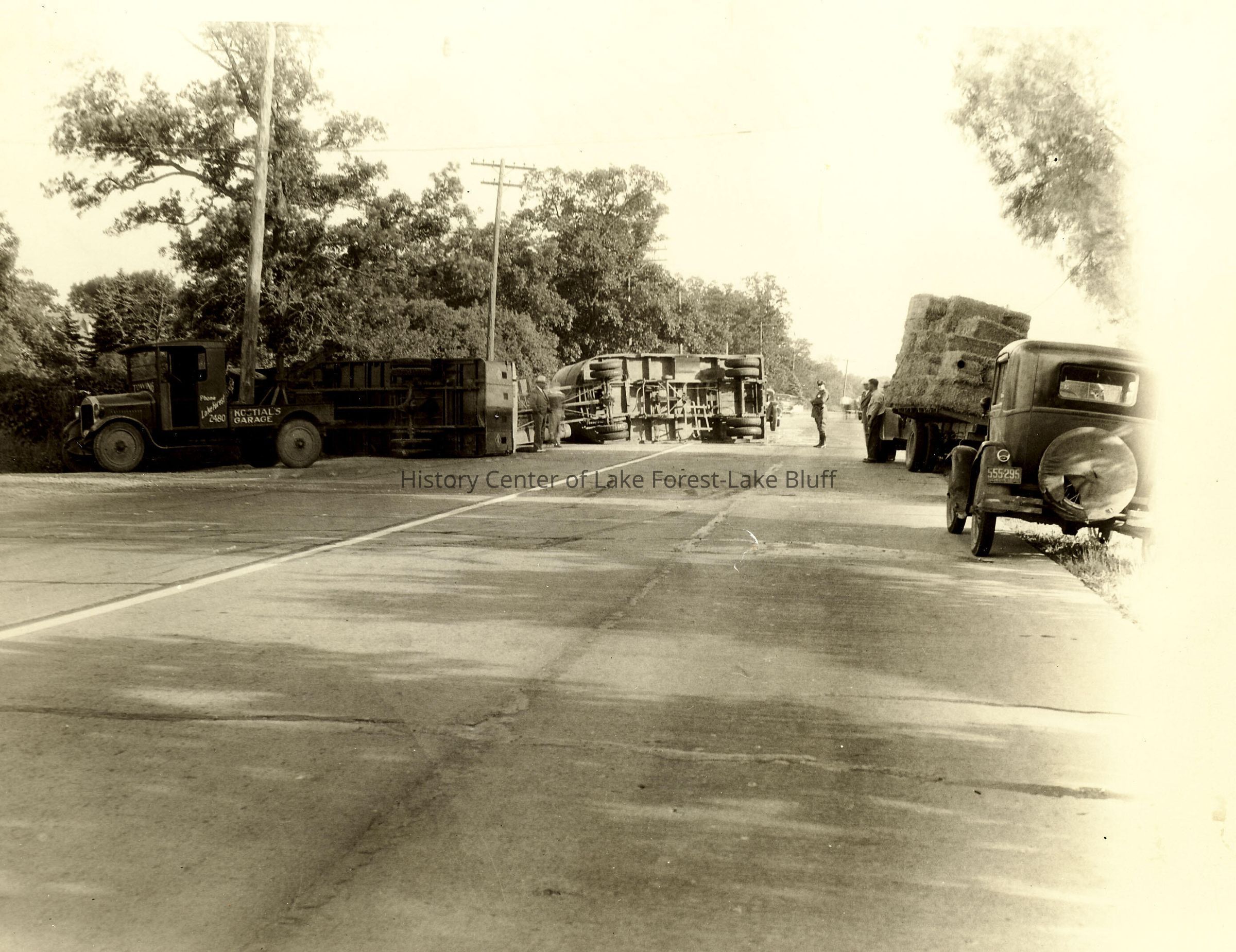 Image of an accident - two overturned trucks on the side of the road. There is another truck with bales of hay at right, and a small truck labeled Kostial's Garage at left. A police officer is standing in the road - Officer Frank Metzger. Location unidentified. Undated - 1930s-1940s.