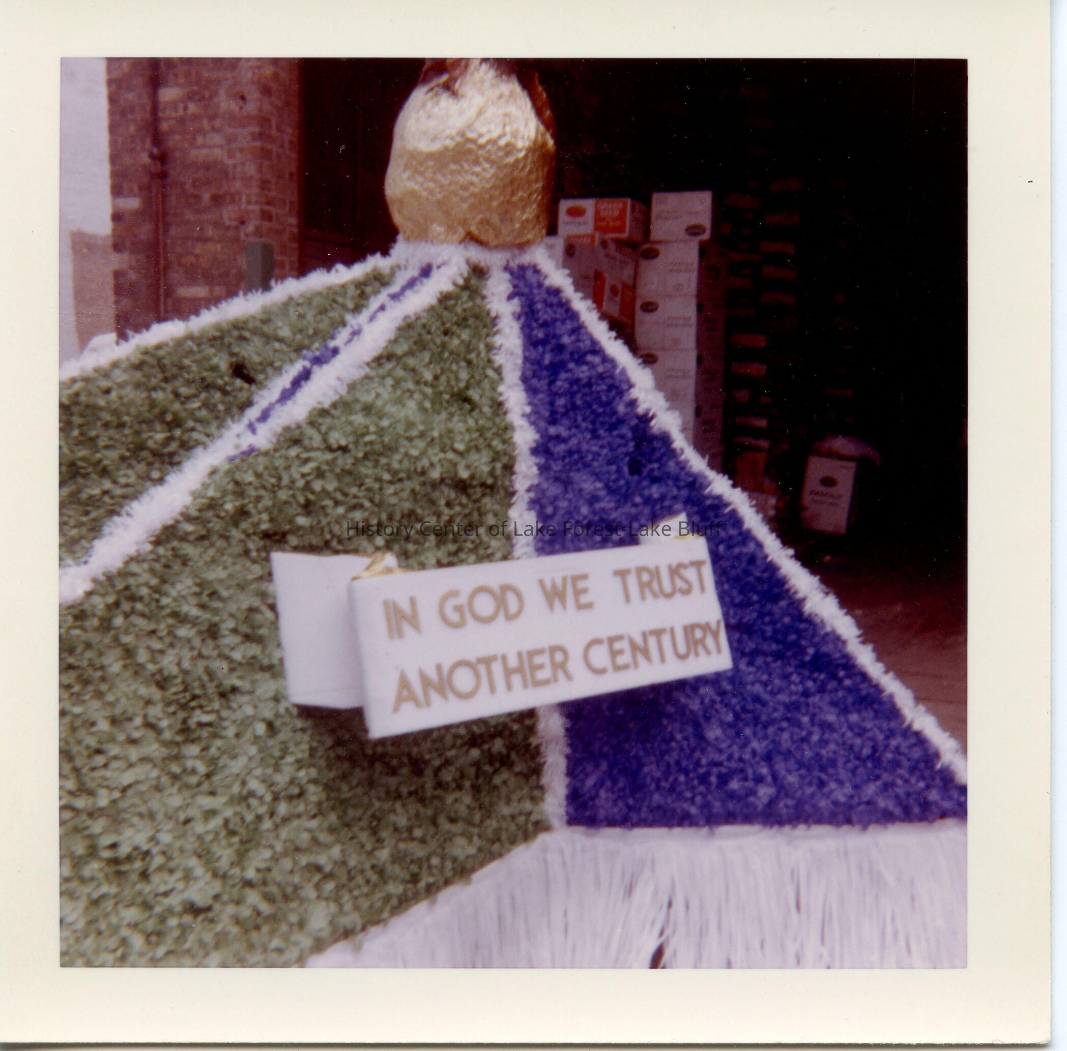 Kodacolor print dated August 1961. Close up of banner. Blue and green star-shaped parade float topped by gold eagle and American flags. Banner reads "In God We Trust. Another Century." Probably for Lake Forest Day parade.
