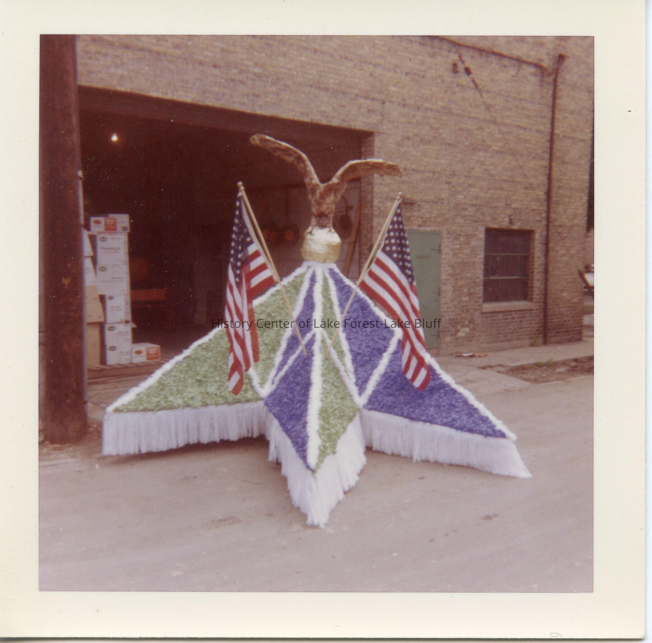 Kodacolor print dated August 1961. Blue and green star-shaped float topped by eagle and American flags. Lake Forest Day: 100 Years of Celebration, p. 68.