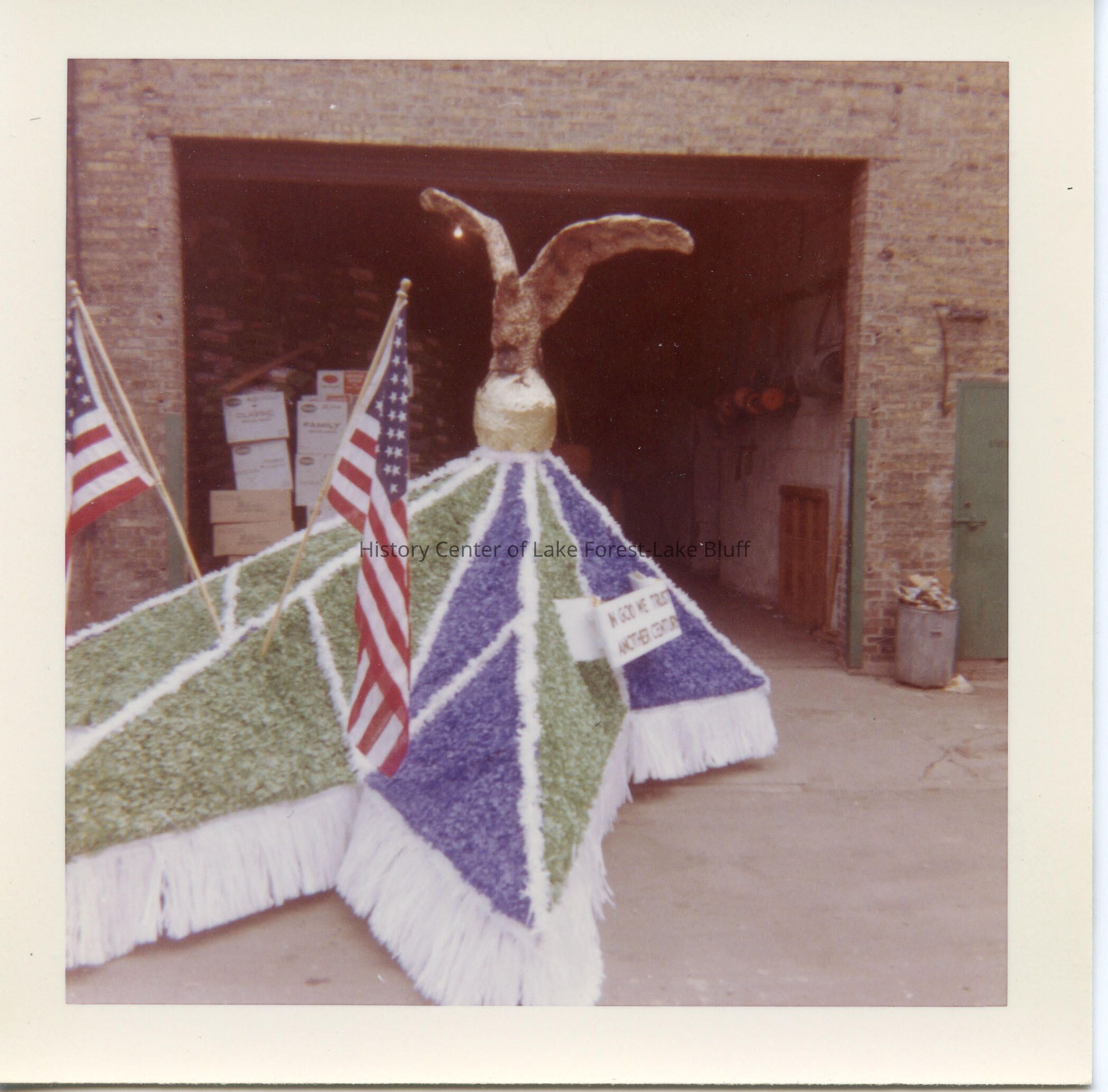 Kodacolor print dated August 1961. Blue and green star-shaped parade float topped by gold eagle and American flags. Banner reads "In God We Trust. Another Century." Probably for Lake Forest Day parade.