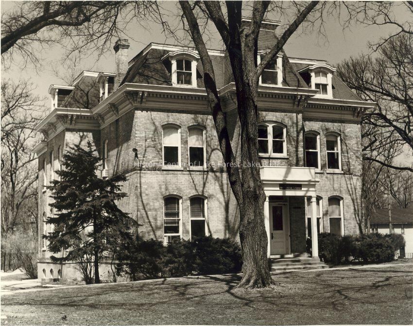 Patterson Lodge, Lake Forest College. Built 1879. Photo dated 1979. The ornamental wooden cornice which crowned the first floor and entrance porch has been removed.